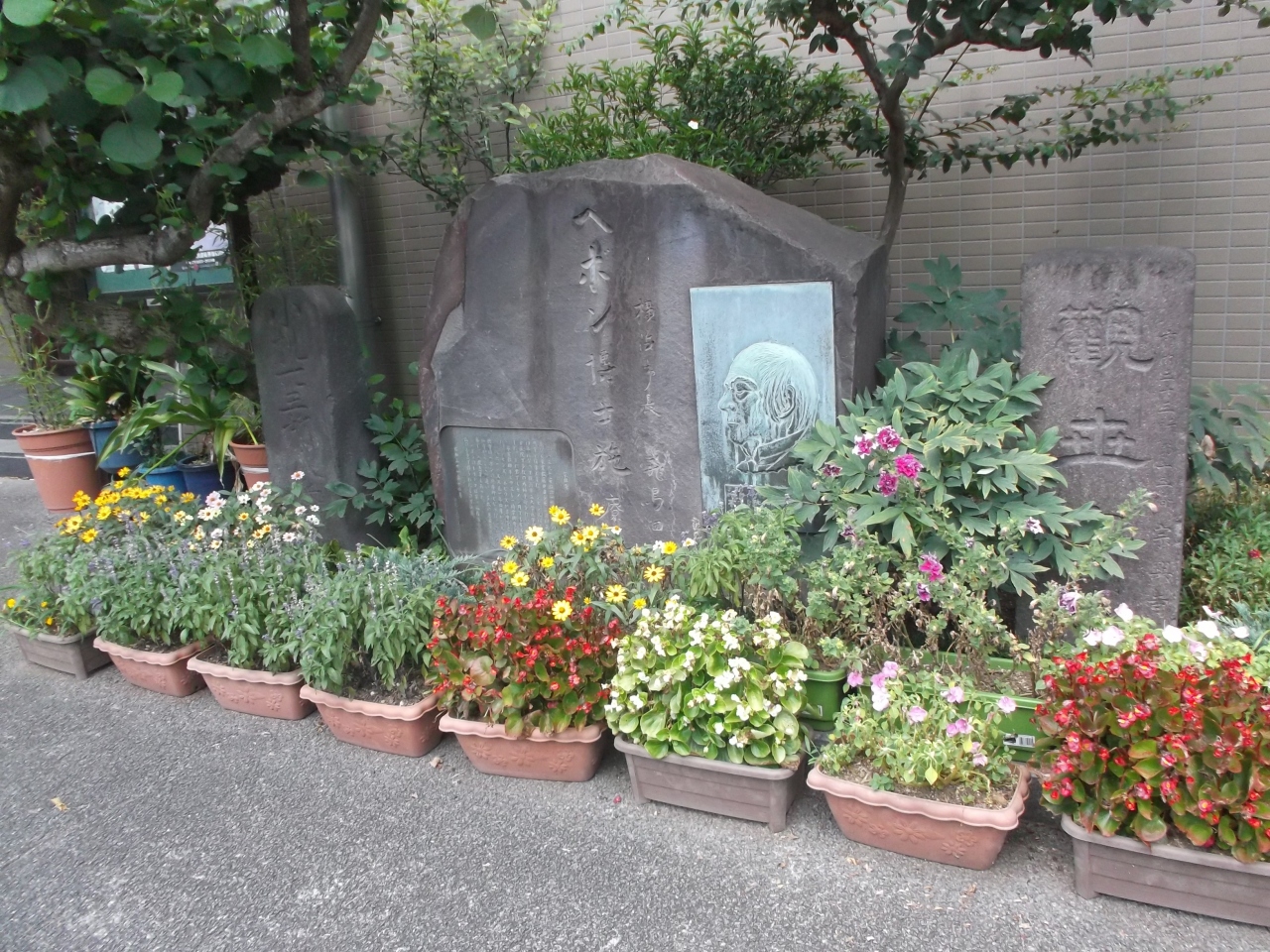 ヘボン式ローマ字でお馴染みのあのヘボン氏のレリーフ入りの石碑施療所跡の記念碑が、花壇の中に建っています。