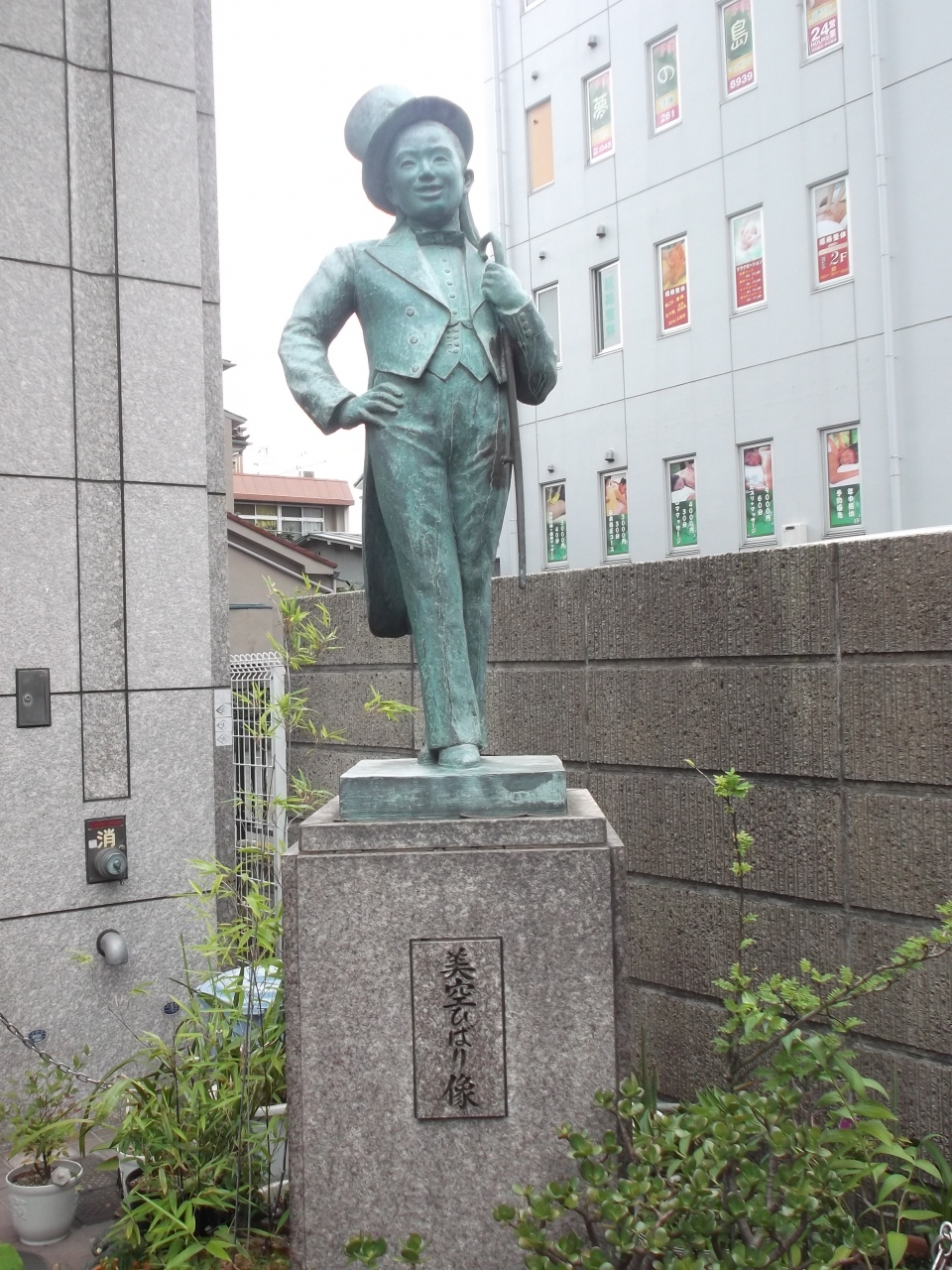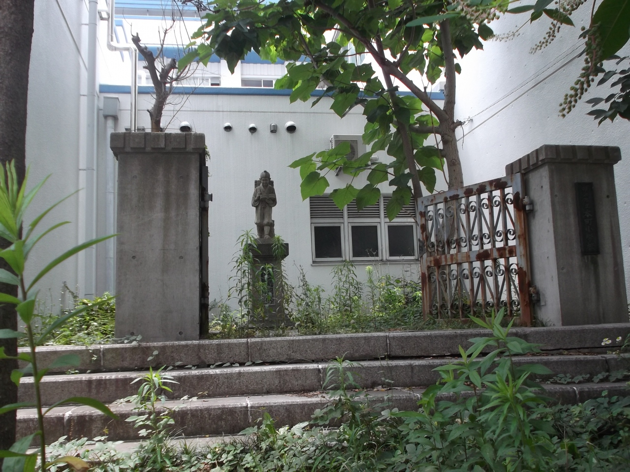 校門脇のコンクリート袖柱(塀)の合間から二宮尊徳・金次郎像が隠れるように置かれています。今では誰にも見られない状態、かっての学校敷地にあったものなのでしょう、その保存と思われますが(詳細承知していません)。何か恣意性があるのか?、もっと表に出せばいいのに・・旅人の心をくすぐる。- 旅行時期