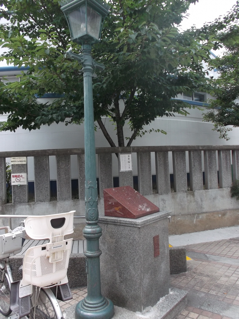 JR桜木町駅・野毛大通りと動物通りの脇からが「音楽通り」、紅葉坂に向かい歩いてゆくと本町小学校、校門前は自転車が一杯停めてありますが、そんな中にガス灯が建っています。その下には記念碑も。