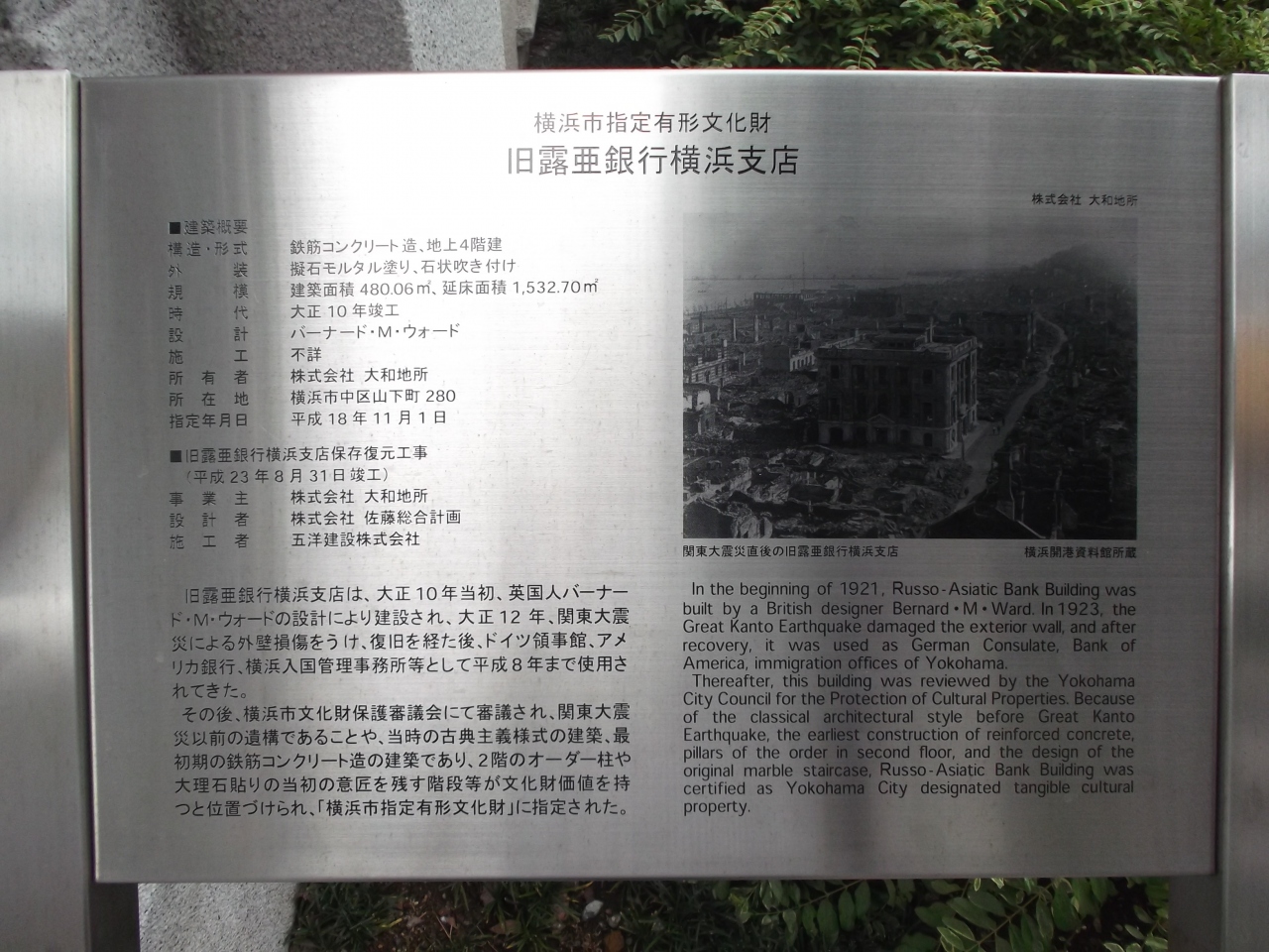 この建物、横浜市指定有形文化財とあります。旧露亜銀行横浜支店、大正10年築です。- 旅行時期