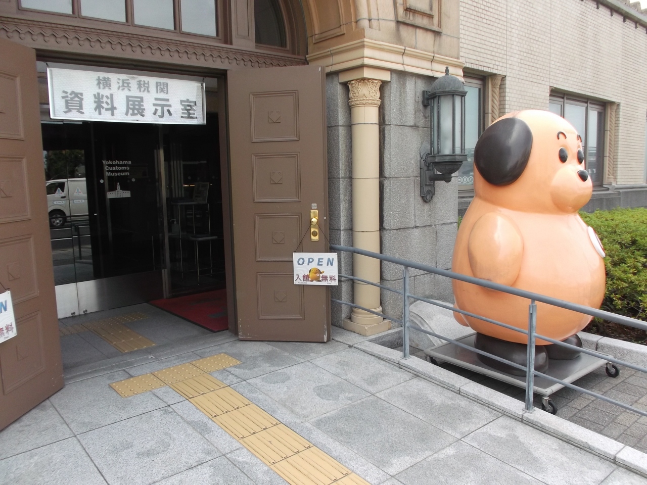 横浜三塔のクイーンの塔で知られている横浜税関、海岸通りにあります。正面から象の鼻方面に回り込むとカスタムくん(キャラクター)が立っています。そこの入口が資料展示室、入場無料です。中に入ると税に関する歴史、横浜港での資料等が展示されています。