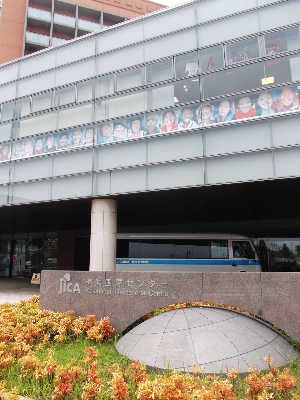 新港中央交差点の上に架かる円形の歩道橋。横浜ワールドボーターズ2階、JICA横浜国際センター2階海外移住資料館入口につながっています。国際大通り方面から赤レンガ倉庫に向かう際にはここを通ります。エレベータ設備がJICAの建物と向こう側にあるので利用できます。
