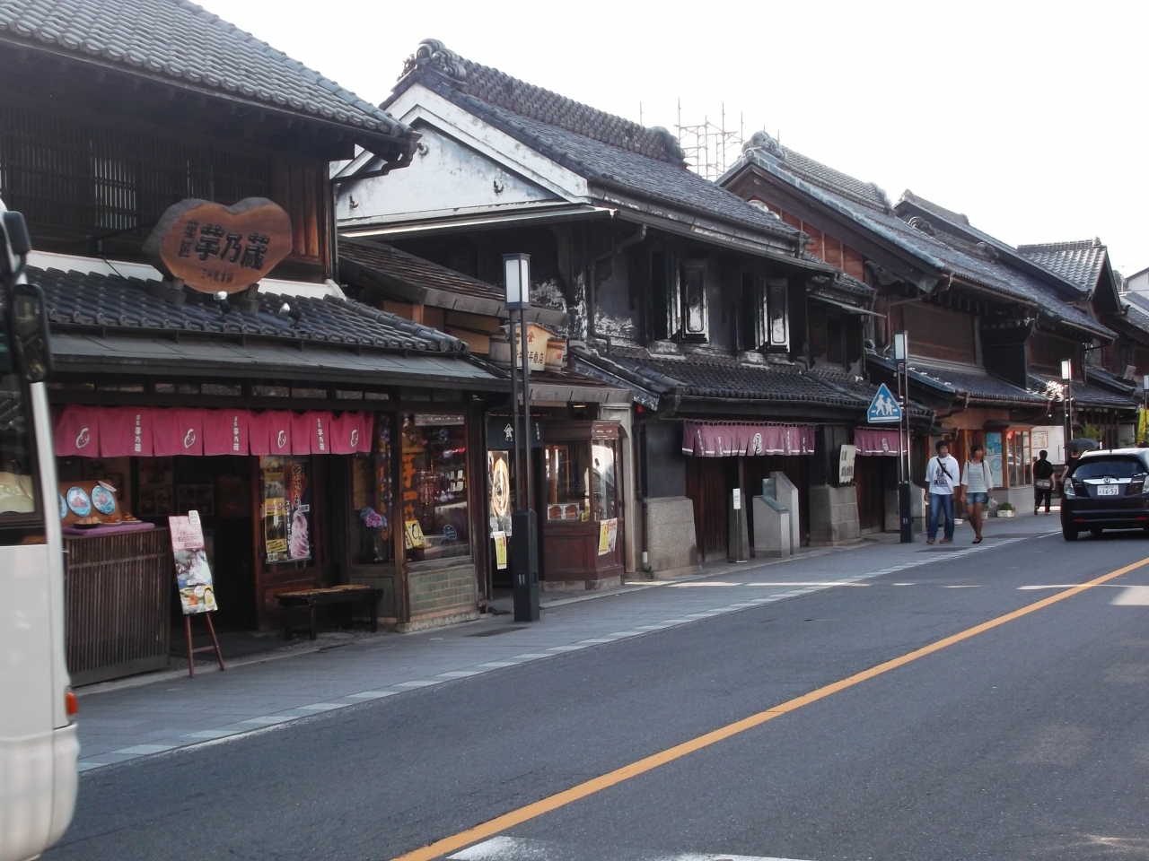 お江戸の情緒、明治の匂いがする町並み通り、川越に来たらまずはここへの観光スポット。仲町交差点から札の辻交差点までの400米ほどに30軒ほどの蔵造りが軒を連ねています。美しい日本の歴史的風土100選だけあって観光客のみなさんがぞろぞろ歩く中、車両も多い。