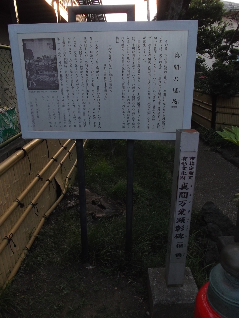 市川は文学の街、ご当地ゆかりの文化人(北原白秋・幸田露伴・永井荷風等)多く、万葉(集)の歌でも親しまれています。これらの紹介作品の説明板が個々に設置されている文学の道と呼ばれているところがあります。真間3丁目、国府台女子学院正門付近の5差路を真間川に至る桜並木の公園風道(左側の道)。長さ400メートル、幅6メートルのプロムナード。お子様用の動物遊具・ベンチもあり散策や日陰涼みしている光景があります。遠方からは文学散歩に訪れる人も・・・。