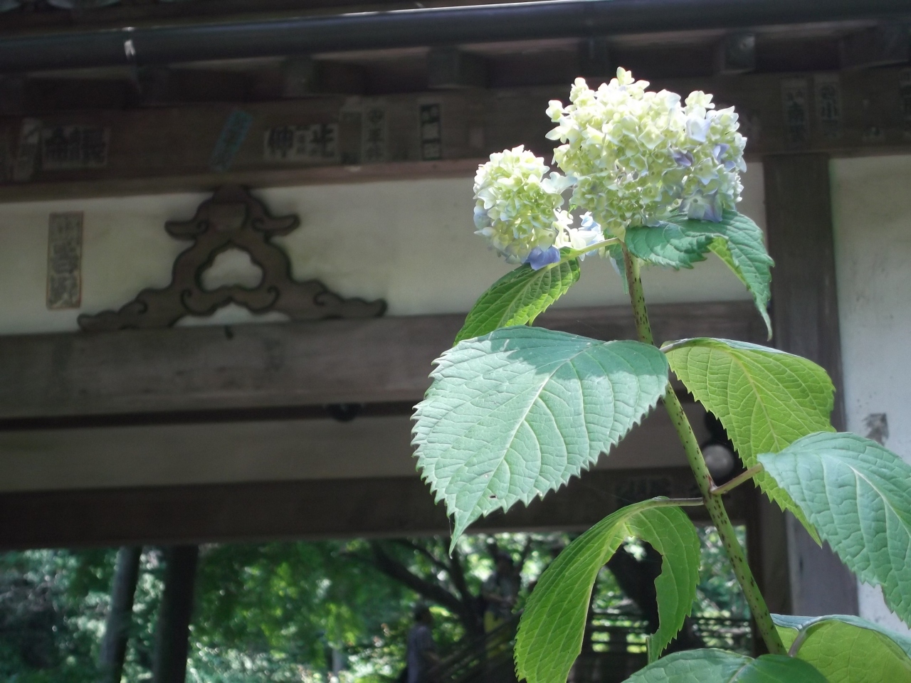 参道で青い紫陽花の花、ひとつ・ふたつ・・みつけ!。みなさん写真撮ってました。