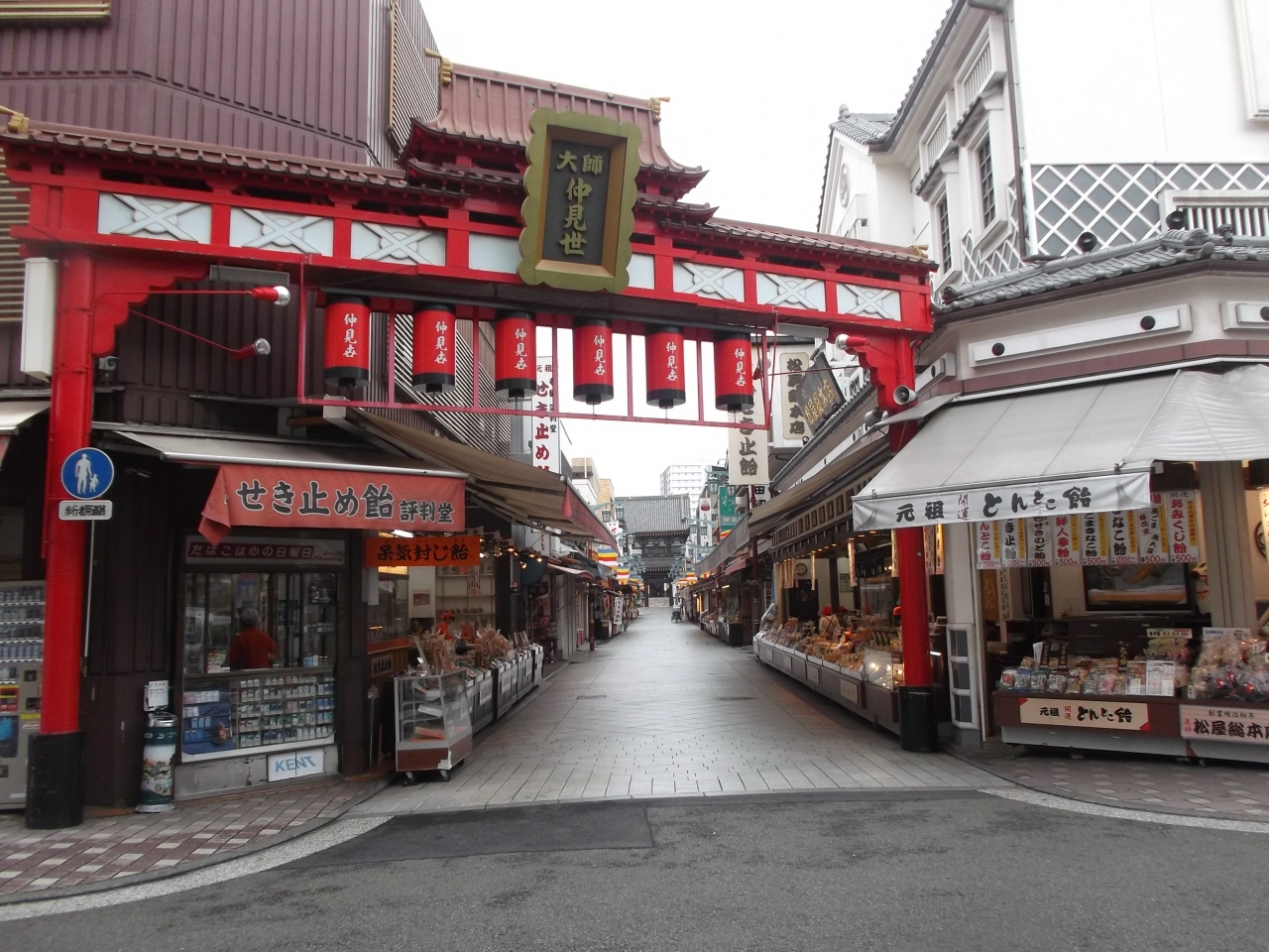 川崎大師平間寺の山門に一直線に続いています。道沿いには伝統あるお土産飲食店の呼び込みが賑やか・・これがここの風物詩。せき止め飴にくず餅、ダルマ煎餅などなど、冬なら甘酒が・・。