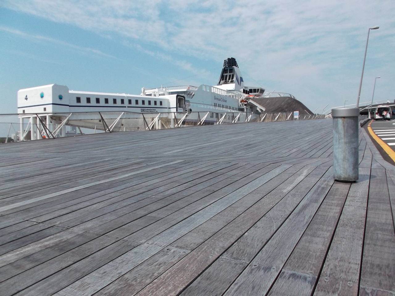 ウッドデッキのボードウォークに芝が配してある・・お手々繋いだカップルさん、読書にふけるお一人さん、写真撮りまくりの俄カメラマン。何処からかの団体御一行グループ、野外授業の生徒さんも・・通称「大さん橋」ヨコハマ観光のメインスポット。クチコミスポット投稿でも上位ランクで人気です。