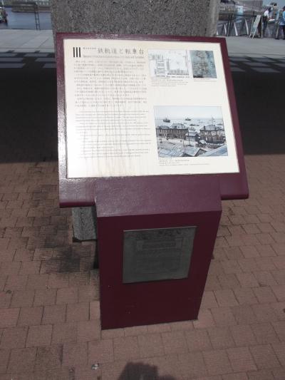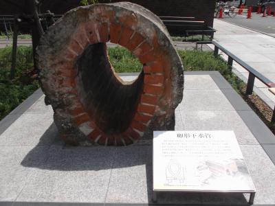 「明治10年代に築造されたレンガ造りマンホールと下水管」写真解説付きエッチングのプレートがあります。その床上の三角のガラス越しに遺構をみることができます。実際覗くとよくわかりませんが・・見てみます?。- 旅行時期