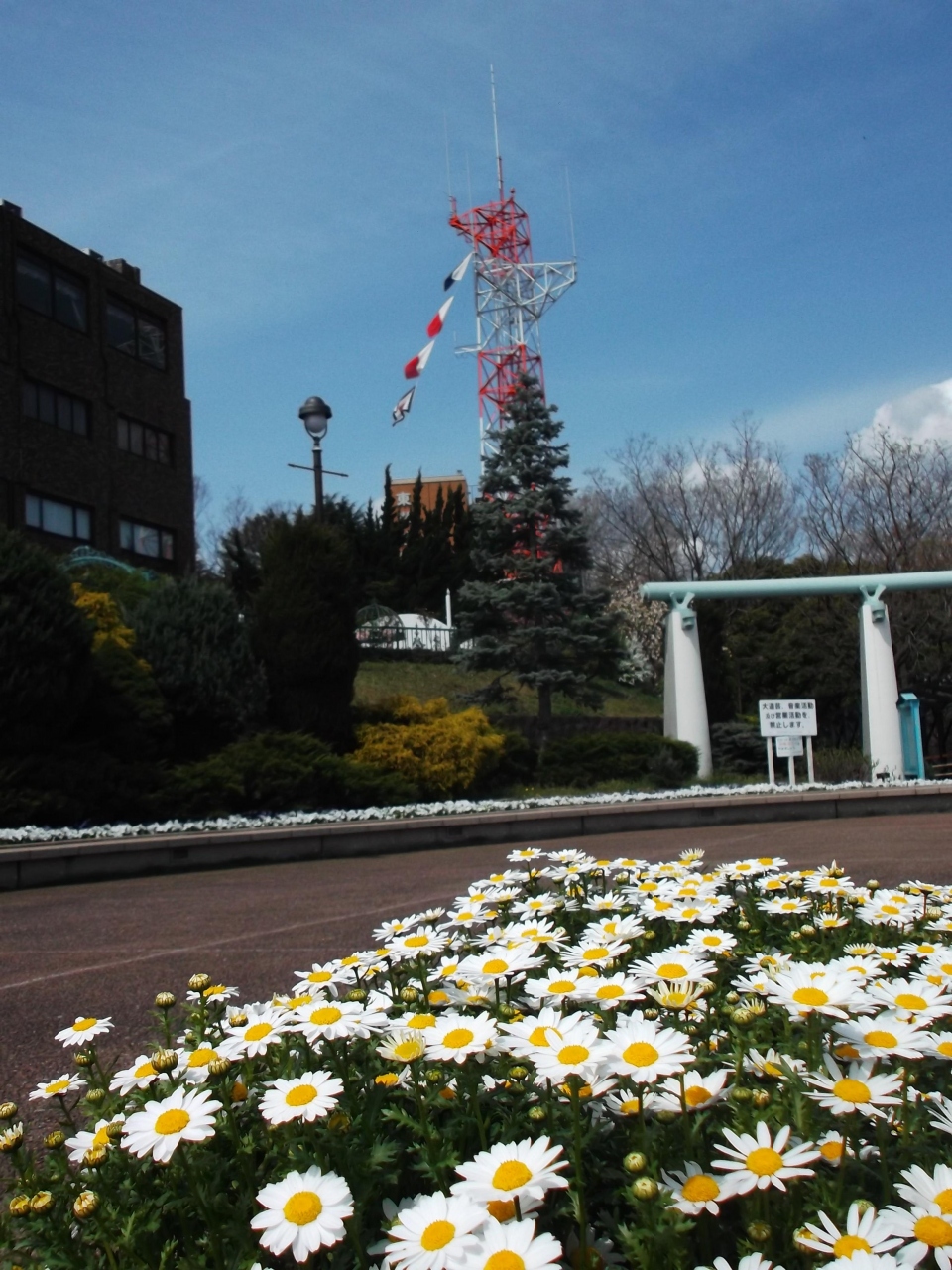 港の見える丘公園展望台広場から、鉄塔に4枚の信号旗が大空高くはためいているのが見えます。