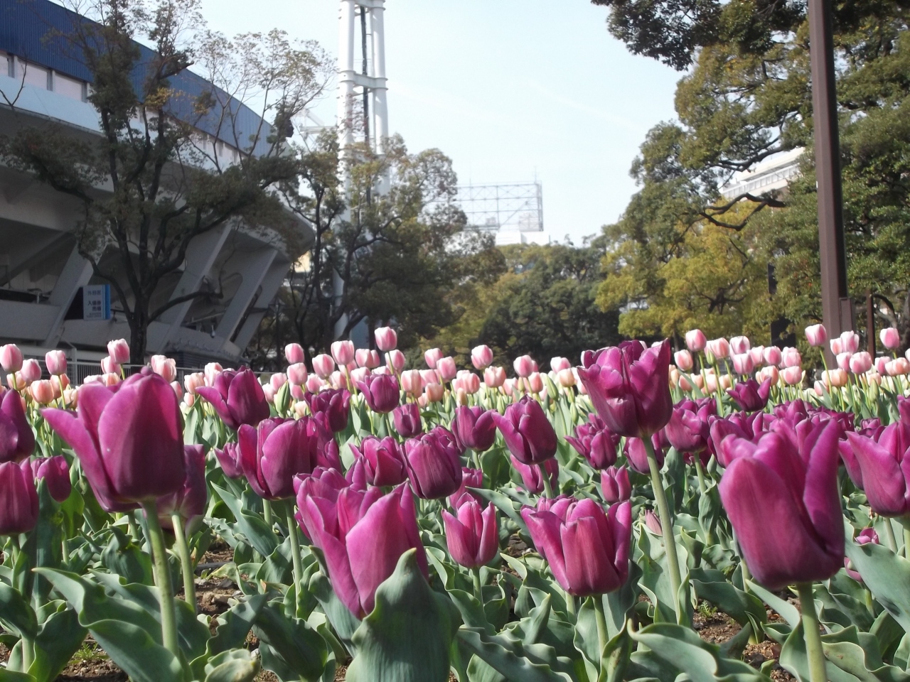 JR根岸線関内駅徒歩5分もしない横浜公園、横浜DeNAのホームグラウンドの横浜スタジアムがあります。周囲の花壇にチューリップがいっぱい。それぞれに種類の名札が付いています。色彩別に端正に咲きそろうのでそれはそれは美しいです。- 旅行時期