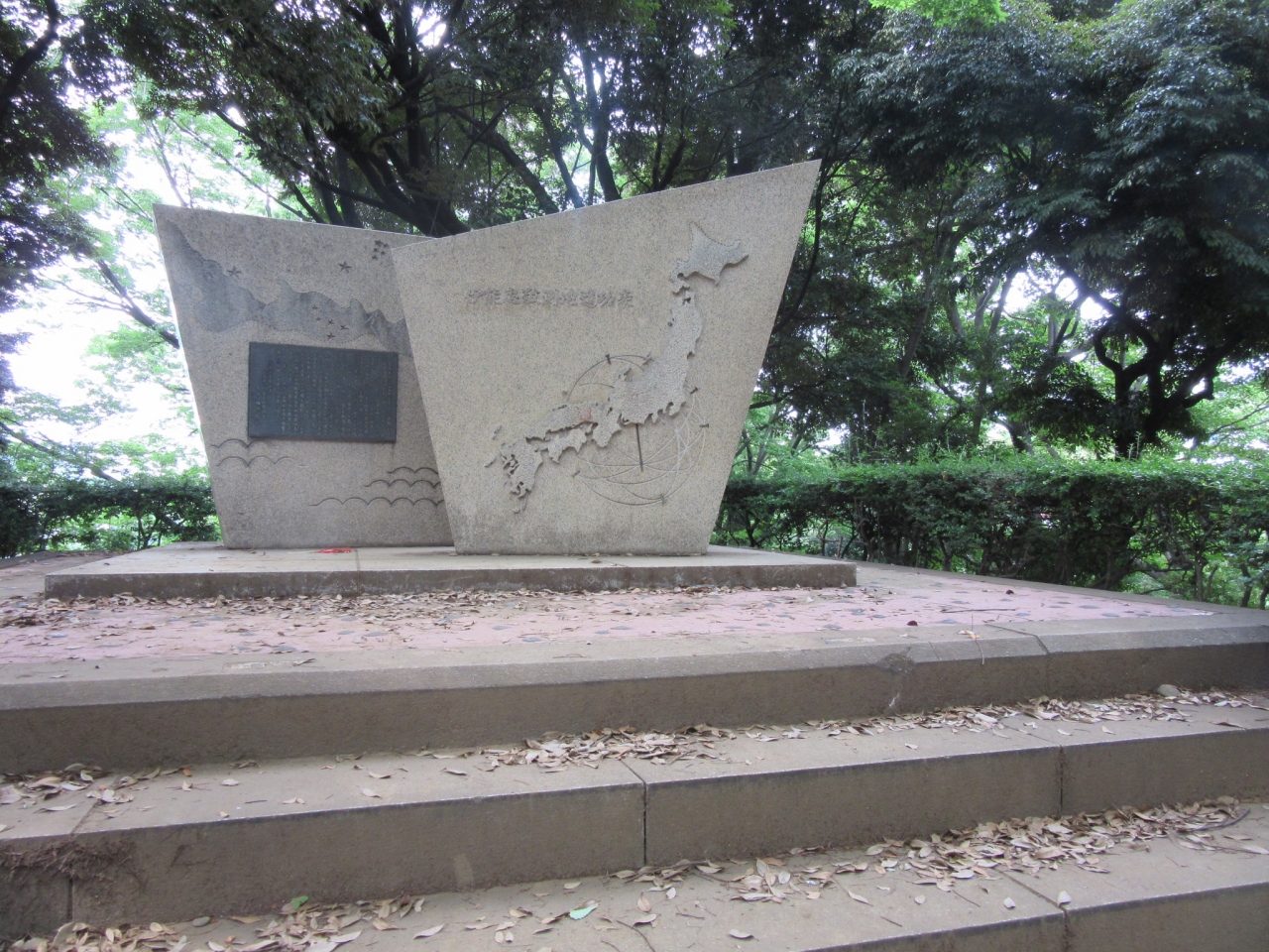 芝公園芝丸山古墳の高台位置、樹木に覆われた空間(広場)に威容な石碑があります。近づくと、日本地図が刻まれているのがわかります。コレ、日本地図測量で有名な伊能忠敬測地遺功表・顕彰碑。伊能忠敬ゆかりの碑は各地にもありますが、現在のここの碑は昭和時代に再興したものとあります。