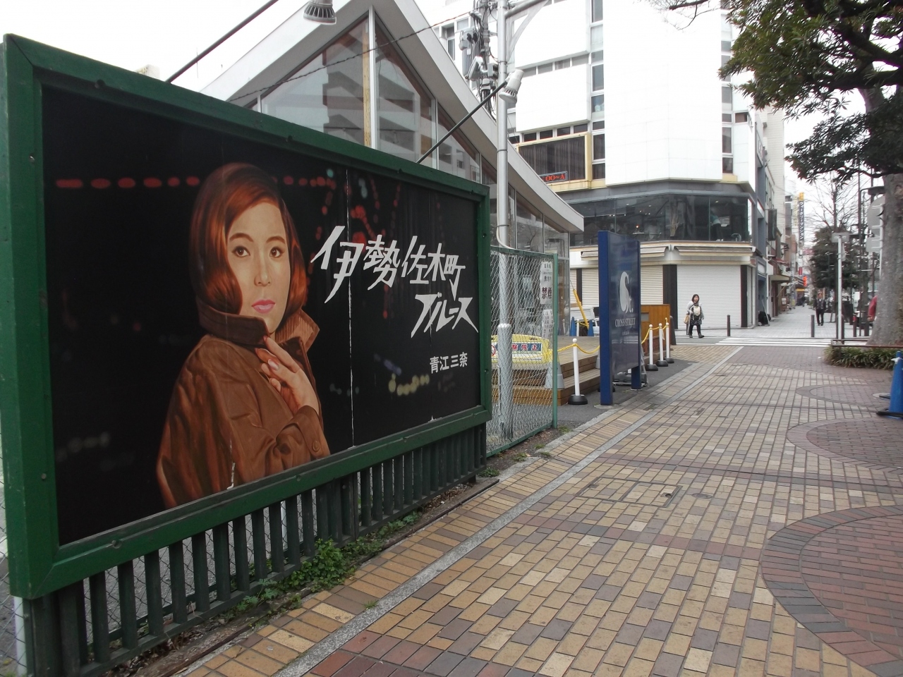 伊勢佐木町商店街通りの伊勢佐木町4丁目、駐車場前に大きな顔入り看板が目立ちます。