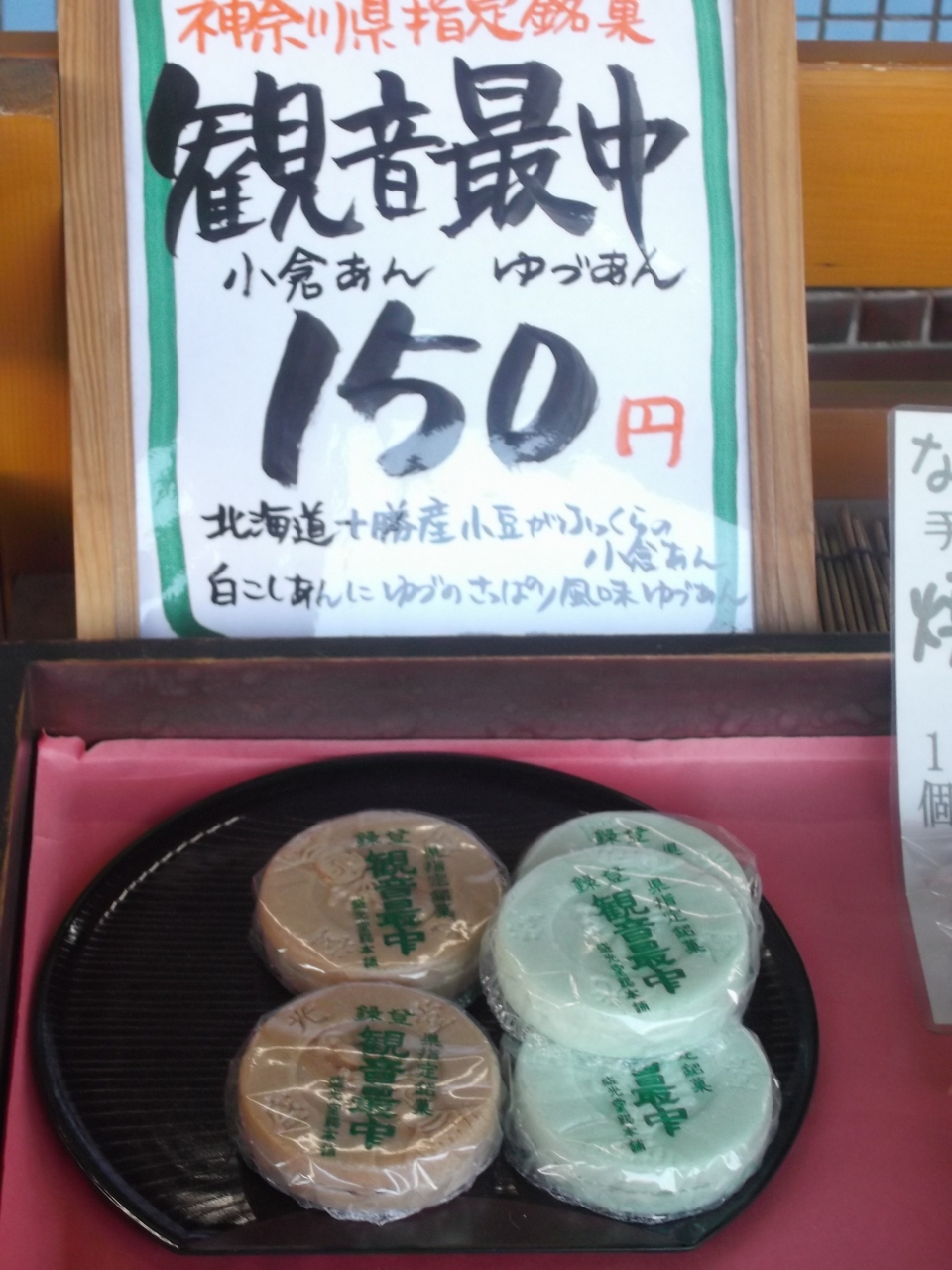 ひと押しのご当地名物、観音最中(150円)。ちょい大きめか、ゆずあんをいただきましたところ風味抜群、甘さ残るがこれが最中でしょう。- 旅行時期