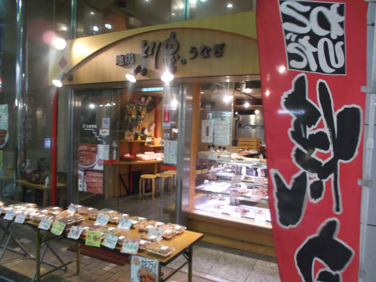 市営地下鉄ブルーライン弘明寺駅出てアーケードの商店街(弘明寺かんのん通り・弘明寺商店街)入口の書店から直ぐ右手にあります。店頭の平台にお徳用の弁当惣菜類が並んでる。店内のショーーカウンターには焼き鳥85円の札とともにいろいろ種類豊富。それもそのはずここは鶏肉専門店と謳ってる。うなぎのノボリも目に付きます。