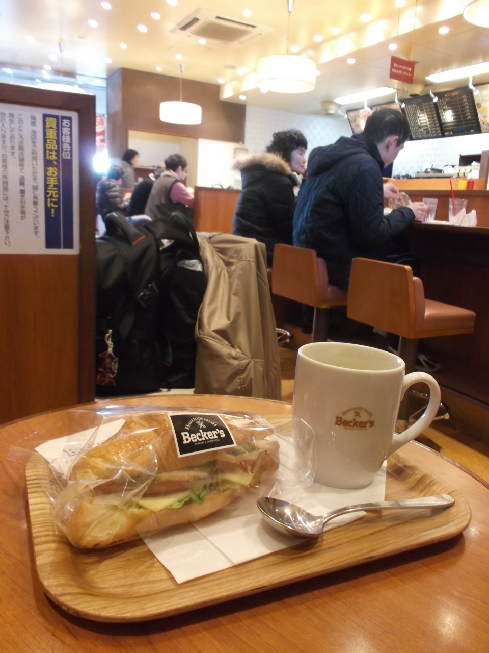 今回、回数券利用で飲み物とサンド。時間調整しながら手頃に飲食なら立地的にも便利でした。飲み物はコーヒーとコーンスープが同じ値段ですので回数券1枚でちょうど(230円相当)です。こういう組み合わせもありですね(写真)。- 旅行時期