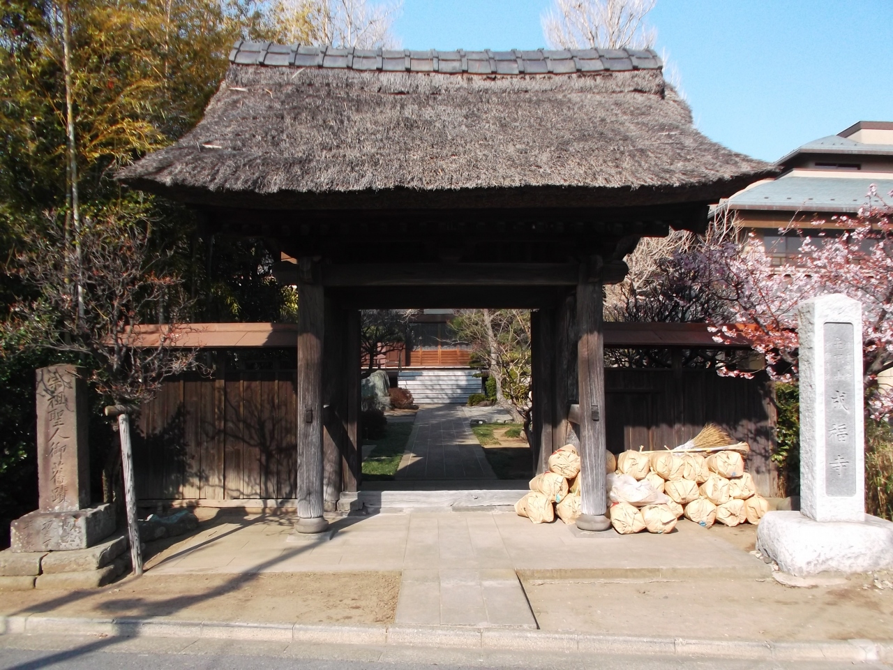 山門は四足門で茅葺き屋根と垣根、門前が絵になります。山門横は駐車場、壁にそって青いプラスチックのバケツが並んでいます。これ蓮鉢の代用。蓮の季節には大きな葉と白い蓮の花が咲くそうです。7月に入ったら来てみたいところです。