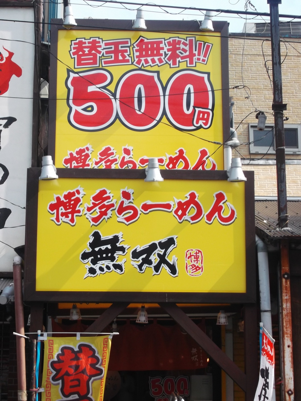 500円・・黄色に赤字の派手派手看板、ラーメン屋さんだぁ。