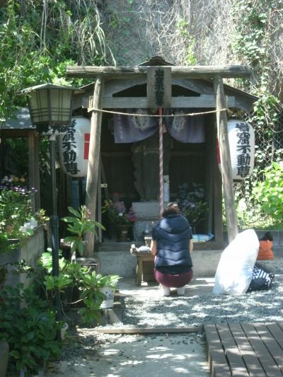 小町通りから川喜多映画記念館の通り沿い、古ぼけて文字が消えかけている標識を見落とすと通り過ぎてしまう。レトロなお茶屋さんがあり、その脇の奥の山岸にこれまた古いお堂があります。中に石造りの不動明王が祀られています。お堂前の参道?には石仏類が並んでお花や植木鉢も。中年女性の方が一心不乱にお参り、清掃されていました。