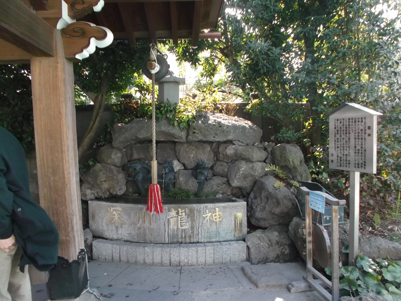 そして、境内入れば左手に深川龍神。祈願札(紙)を水鉢に投入、銅鑼二つたたくと霊験あらたかとか。沢山たたいてる人います。ご利益どうなの?。