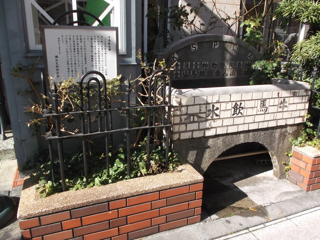 開港時代、車引きの馬が水を飲んだところとされています。では牛は?・・牛も交通手段だったのでしょう(牛車)。その名残、今も伝えてるのがこの「水飲馬牛」です。