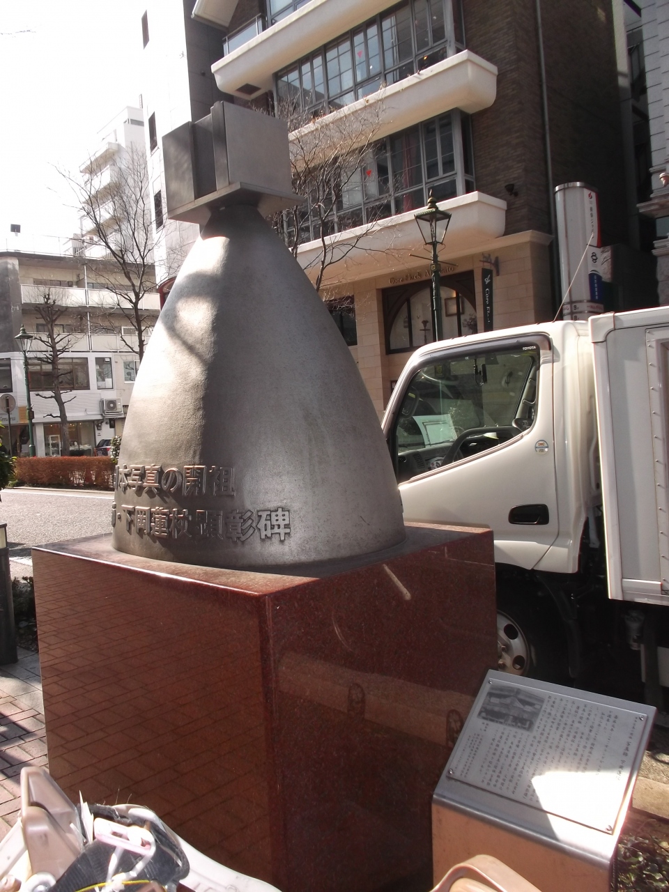 日本人初の写真師は下岡蓮杖という人。アメリカ人フリーマンが写真を日本に伝えたとされる。その記念碑がココ、馬車道通りにあります。ちょっと異様なモニュメント、当時の写真機がモチーフのようです。そう言われるとナルホド・・です。