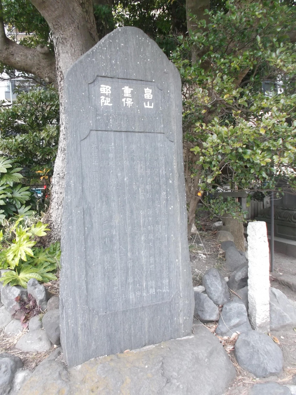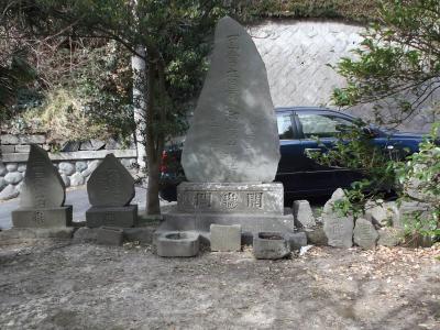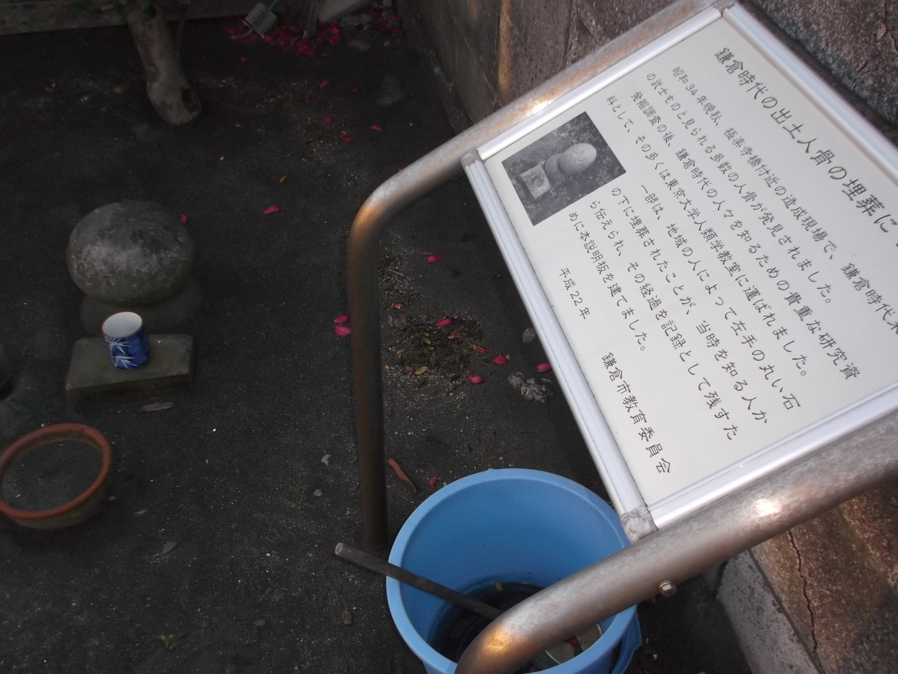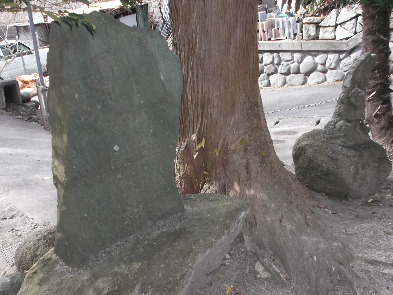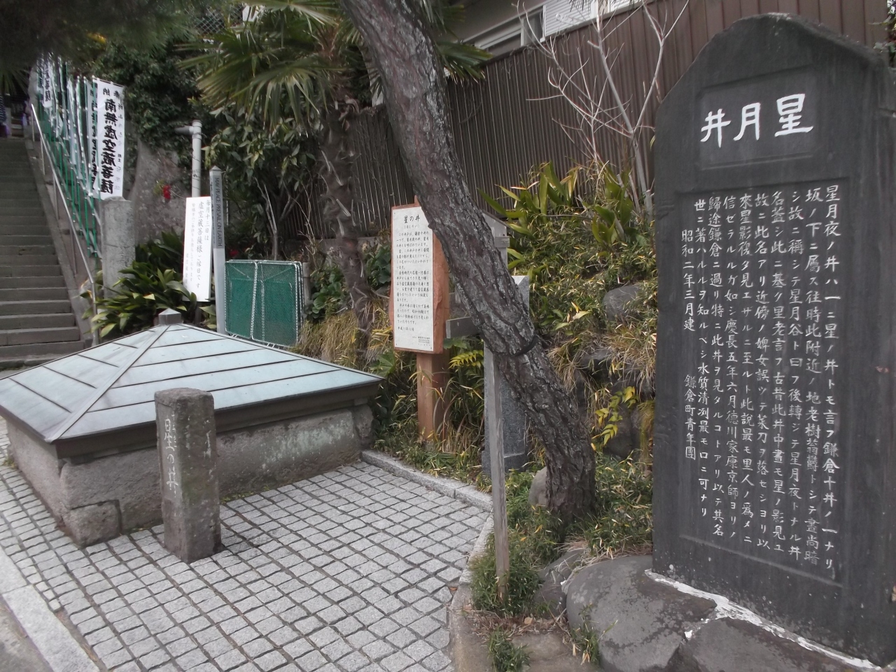 宮殿に向かって左手の緑覆う路傍に石碑や石塔群、ベンチがあります。石碑は畠山重保の屋敷跡碑、石塔は宝筐印塔で重要文化財の史跡[単独スポット登録ありませんので、スポット関連として写真掲載しました]。