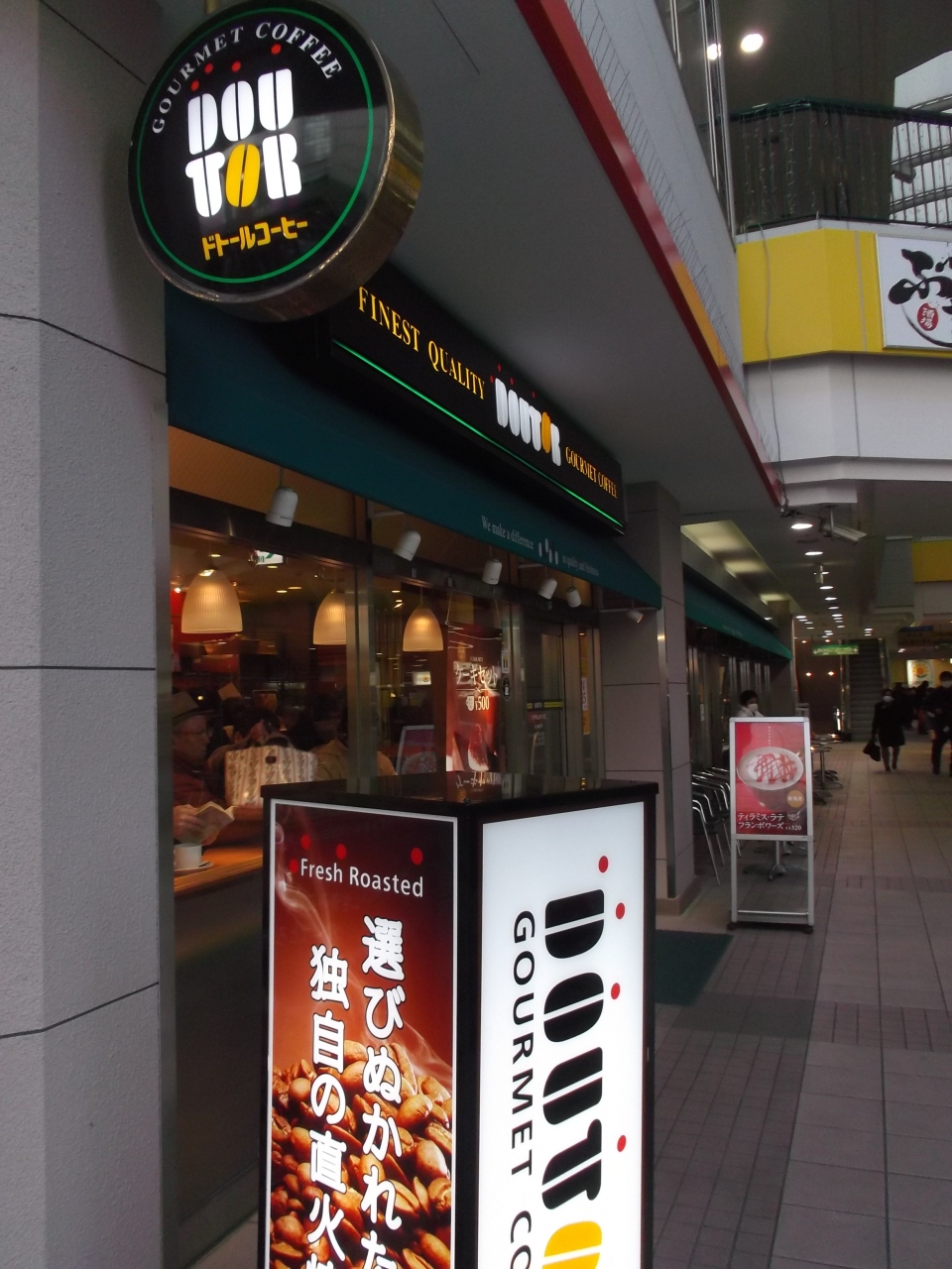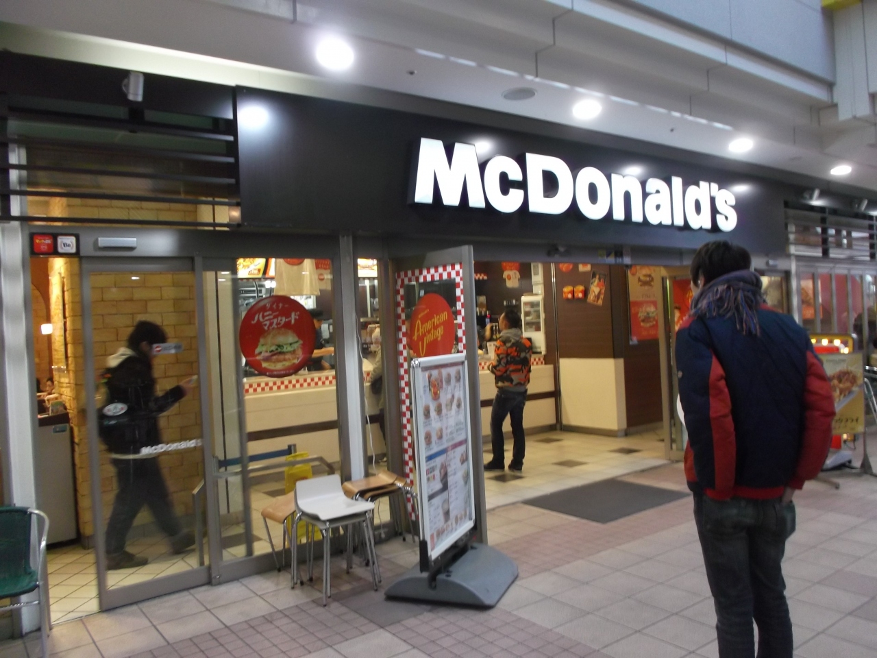 店前の中央通路には椅子机が並んでいます。マックもありますが、テイクアウトしてここで飲食している人います。でも、今は(1月中旬過ぎ)ちょっと寒いかも。やはり店内か、バスの待ち時間にコーヒー啜りました。- 旅行時期