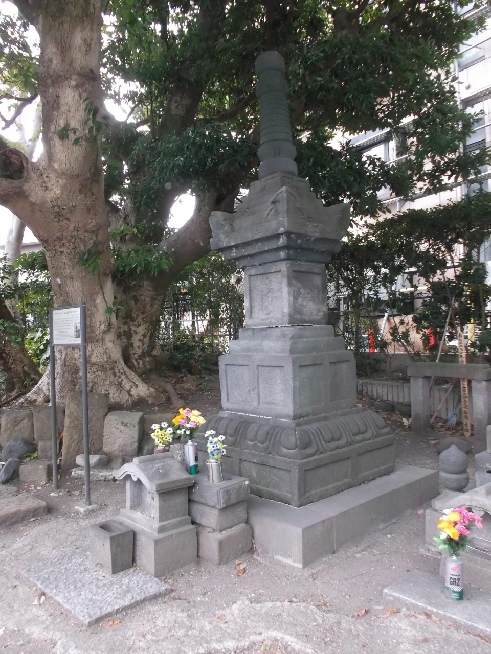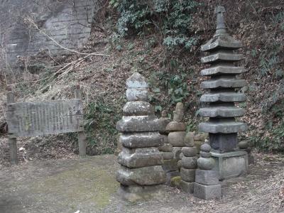 極楽寺駅から成就院に向かうカーブしたところ、白いアパート前の路傍に古い石標が、よく読めませんがこれが目印。半間程の小路に入り突き当たりまで進むと左手に空地があります(アパート裏)。なにやら古めいた解説版があり苔むした感の石塔が並んでいます。三つの石が積まれたような石塔、5層、七層の石塔があります。
