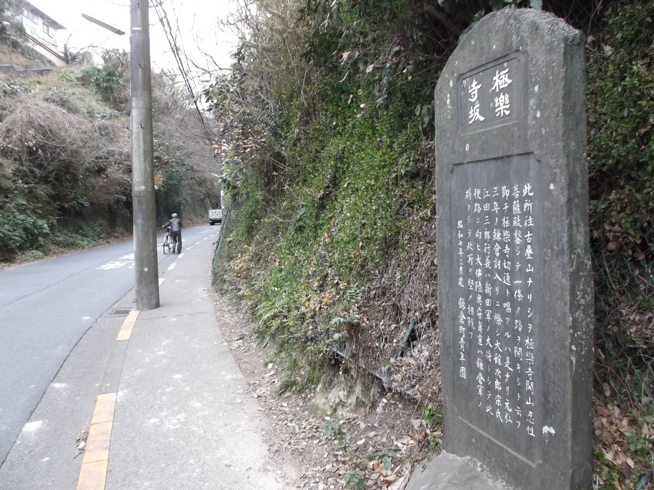 鎌倉史跡碑、市内でよく見かけるお馴染みな石碑です。「極楽寺坂」とあります。