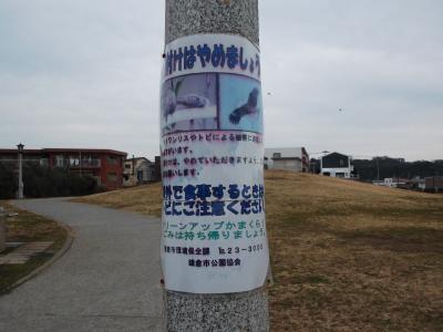 そうそう、この冬の日も上空ではトンピがくるりと輪をかいていました。鳶被害に注意の張り紙が柱に貼ってあります。これ湘南(鎌倉江ノ島)の名物です。