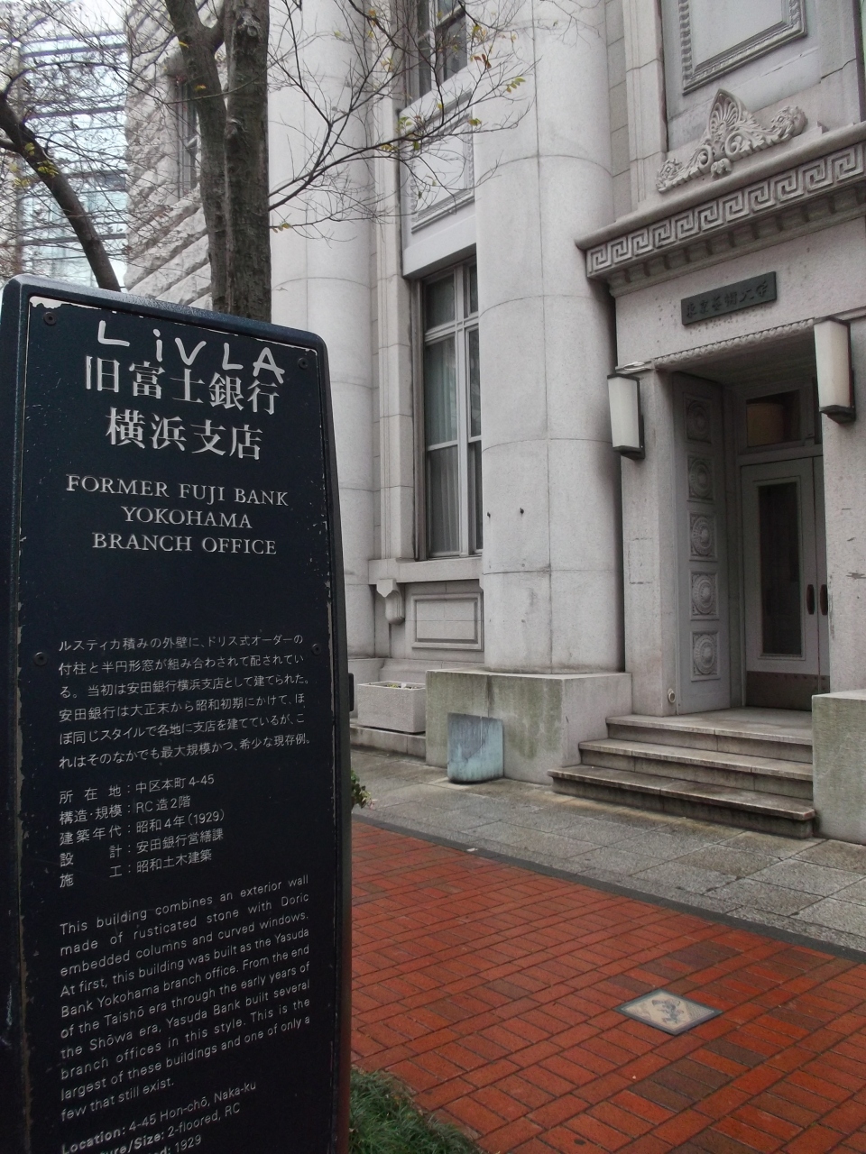 案内標識には旧安田銀行横浜支店・富士銀行横浜支店とあります。でもこの名称の銀行は今ではありませんね。2階建の重厚な石造・コンクリートの建物、現在は東京芸術大学院映像研究科(横浜キャンパス)です。馬車道界隈の昭和初期建物で保存活用されているひとつです。見学にどうでしょう。- 旅行時期