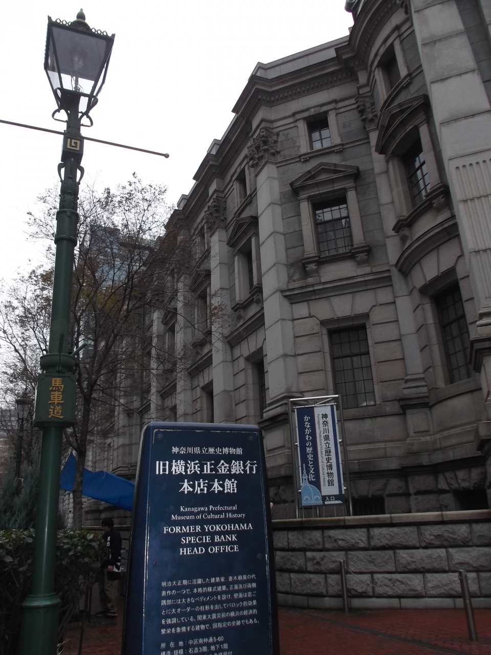 ココ、神奈川県立歴史博物館、標識には旧横浜正金銀行本店とあります。解説版によると後の東京銀行の支店であったとのこと。国の史跡で建物は重要文化財です。