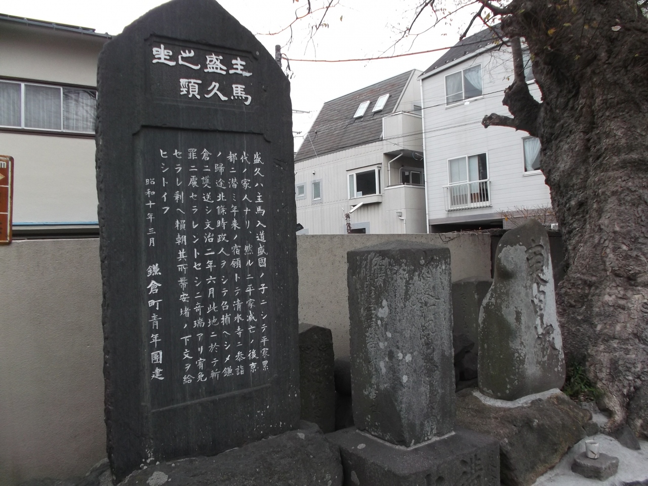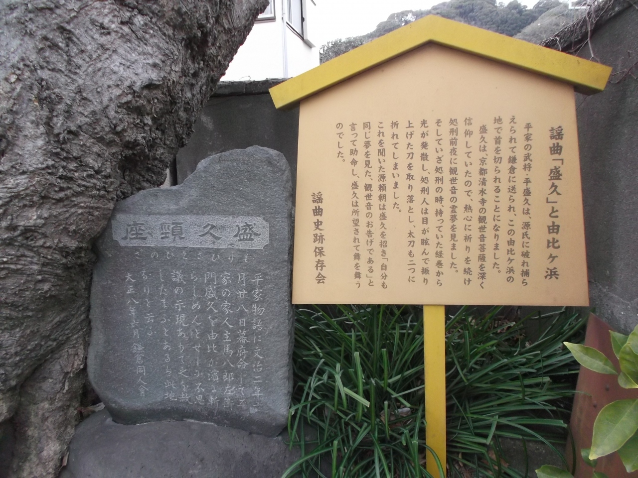参考に小さい方の碑文は「平家物語に文治二年六月廿八日幕府命にて平家の家人主馬八郎左衛門盛久を由比ガ浜に斬らしめんとせしに不思議の示現ありて之を赦したまふとあるは此地なりと云ふ」(転記のためミスあるかも)とあります。