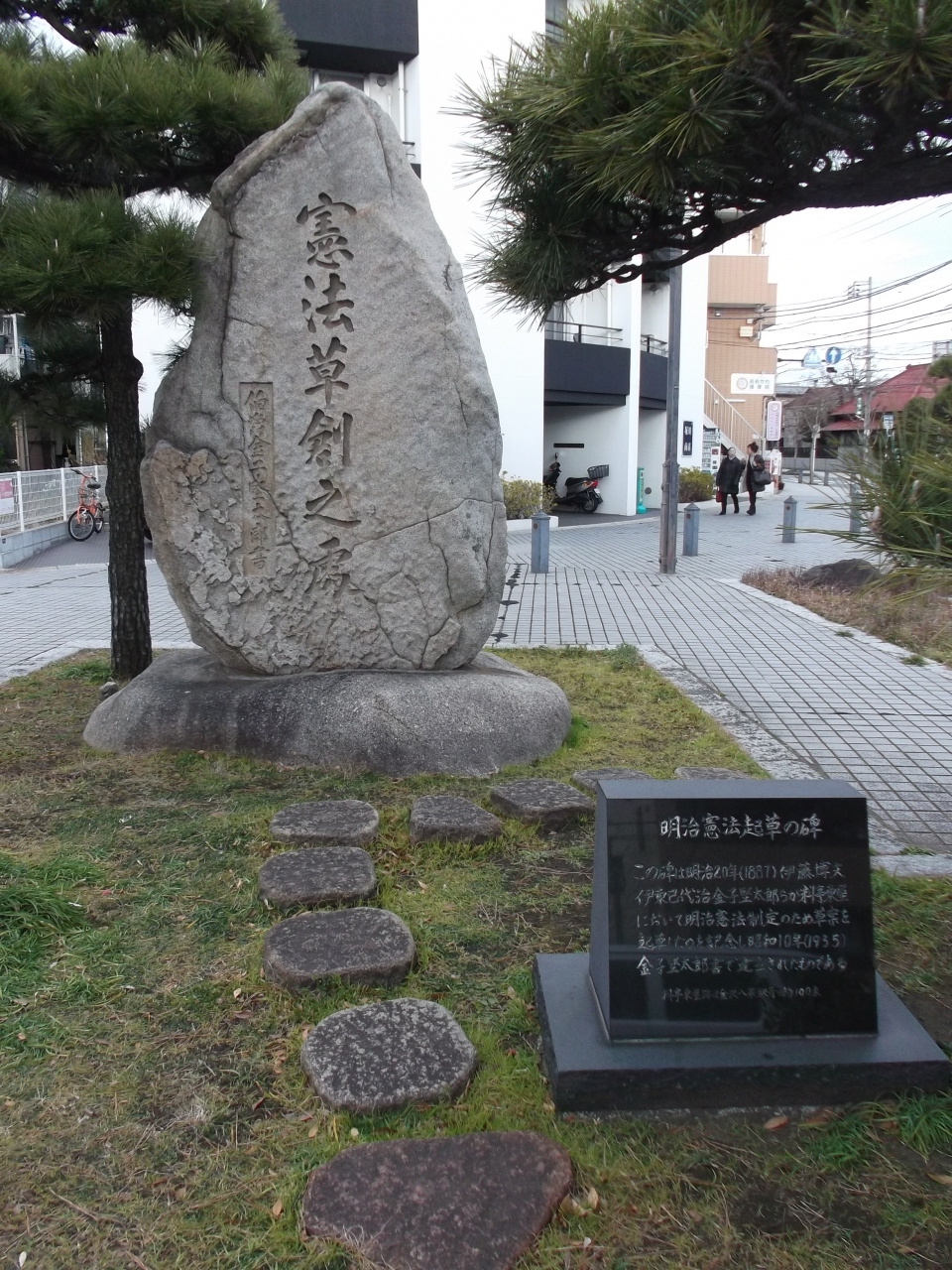 金沢八景駅(京浜急行・シーサイドライン)から瀬戸橋渡り洲崎町交差点のところに洲崎広場という石畳・植木が整っている空間があります。そこに建っている大きな石碑が「明治憲法草創の碑」、碑文あり。ここは明治の時代に伊藤博文等により憲法草案が練られた地であり、それを記念して昭和10年金子堅太郎書によりその拠点であった東屋に建てられ、廃業移動後現在地に至るとあります。いろいろあったんだなぁーと歴史に触れることのできる場所でもあります。
