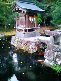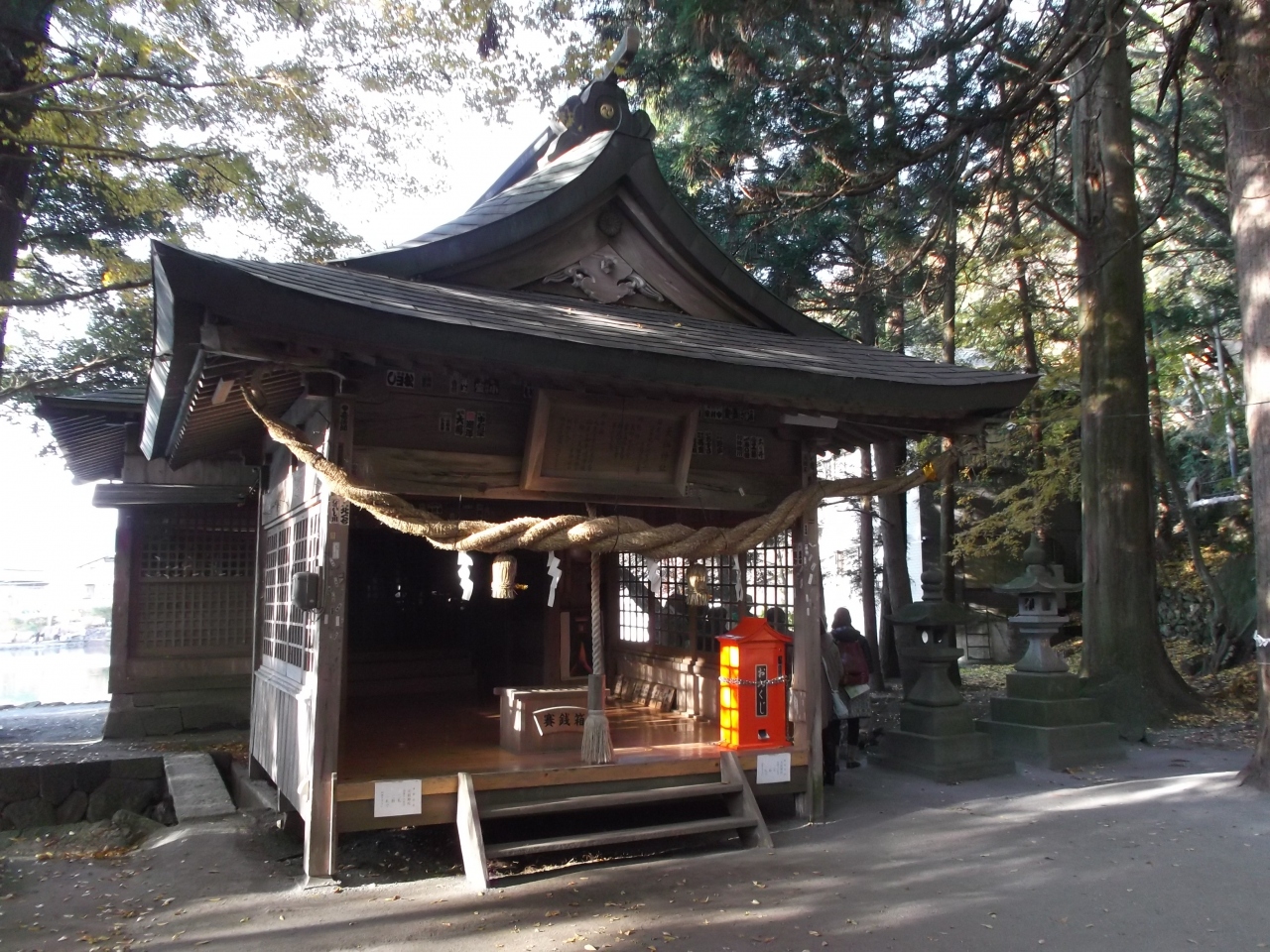 拝殿前に鯉が泳ぐ池があり神橋渡り、左右に小社が祀られています。拝殿向かって左に政正社、右に厳島神です。境内社には御年神社があります。切り株の御神木なども祀られています(台風復興の)。- 旅行時期