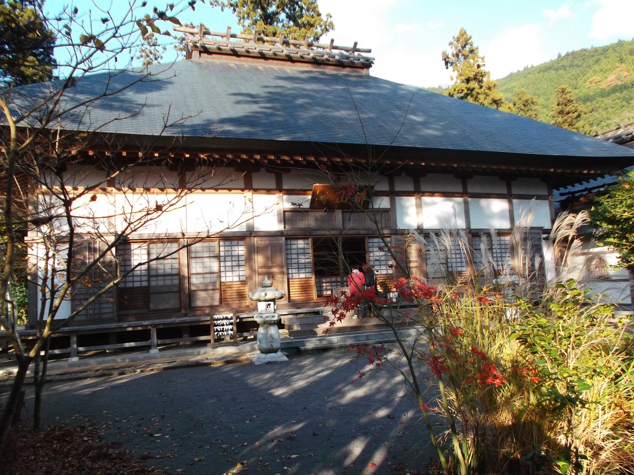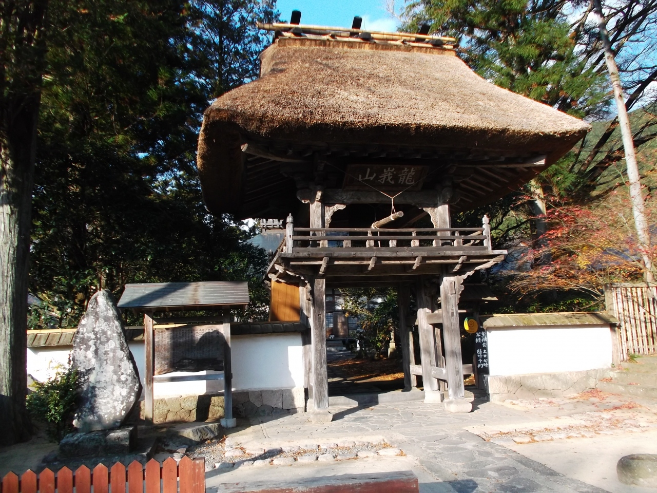臨済宗の佛山寺。オドリ式茅葺屋根の鐘楼門が旅心を揺すります。元禄時代の建造です。境内は花木で緑豊富、花咲く頃は素敵でしょう。ツバキとイチョウは市の天然記念物指定とあります。イチョウは樹齢300年ものとのことです。境内には塔・石造類、観音堂があります。
