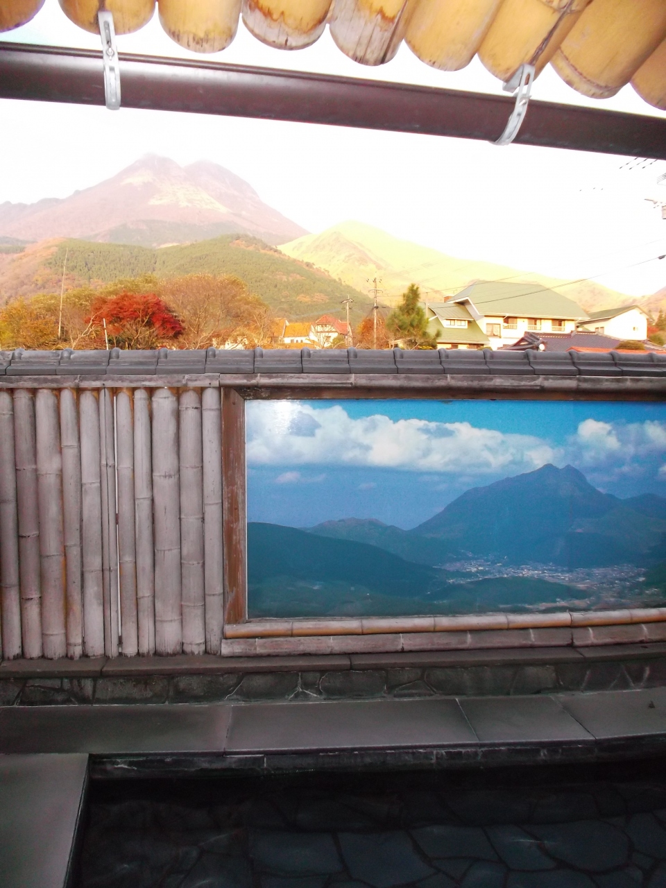 露天からは由布岳絶景、囲いの塀に由布岳の写真が(銭湯風に)あります。