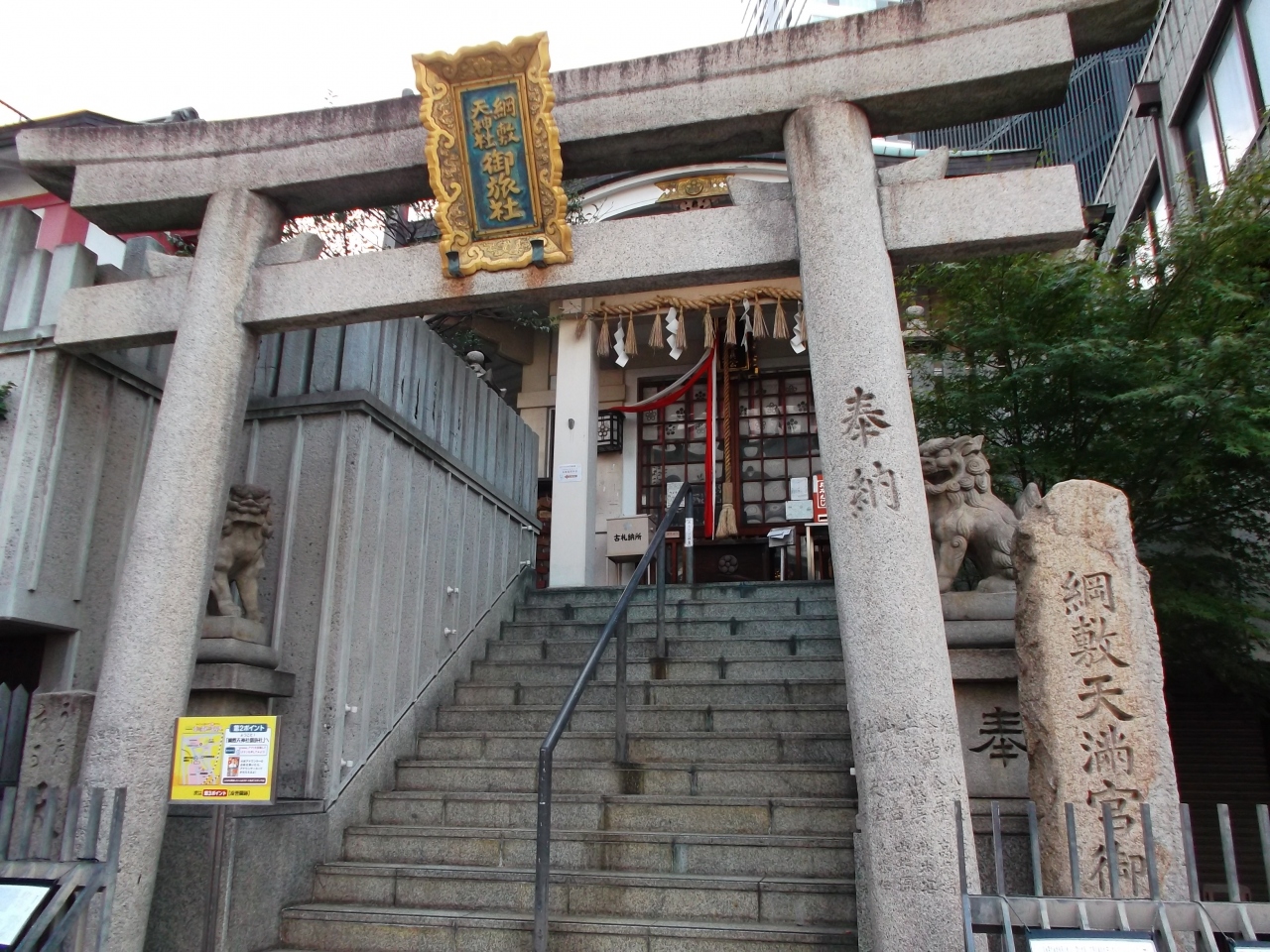 茶屋町を歩いていたらありました。石段上の社殿、境内はとても狭い、もうひとつ鳥居と神社があります。縁結びの玉姫稲荷社です。また、牛舎に撫で牛が安置されています。そうここは菅原道真公ゆかりの神社でした。学問の神社であり商売繁盛も。