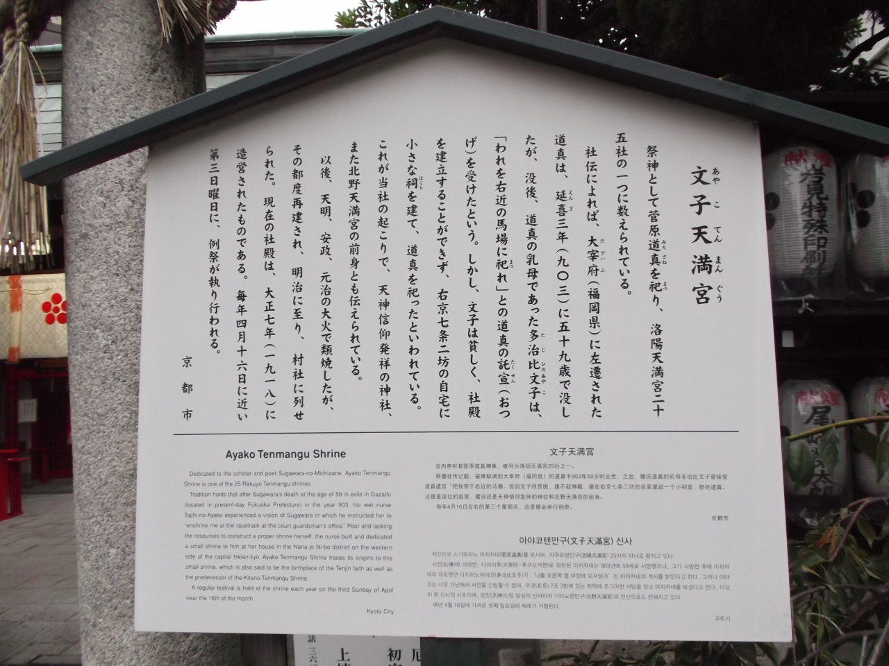 「天神信仰発祥の神社」大きな石標が建っています。北野天満宮の前身神社と言われています。ここ、文子天満宮・・文子(あやこ)とは菅原道真公の乳母・多(田)治比文子・