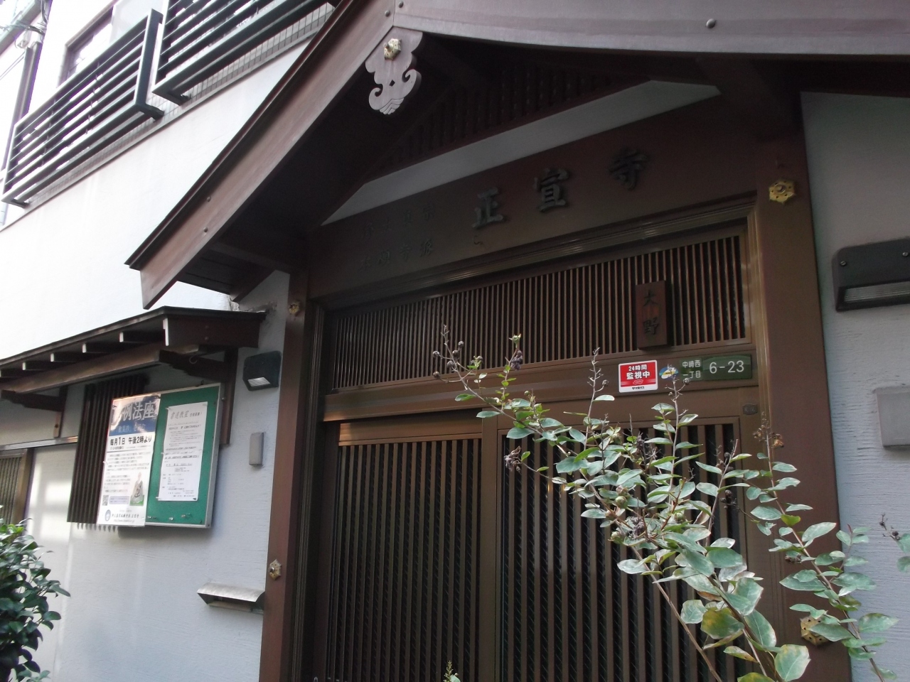 そこは古い民家が並ぶ町内路地にひっそりとあります。それも民家そのもの・・玄関入口、よくみると寺標が掲げてありました。仏法行事の貼紙等の掲示板も。