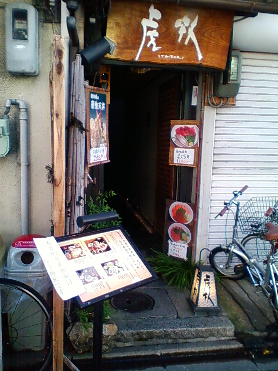 錦市場でランチを・・どこも混んでます。そんなおり、途中の路地先でランチ看板見つけ。お店の名前読めません「虎杖」、メニューに天丼、京都親子丼等があります。
