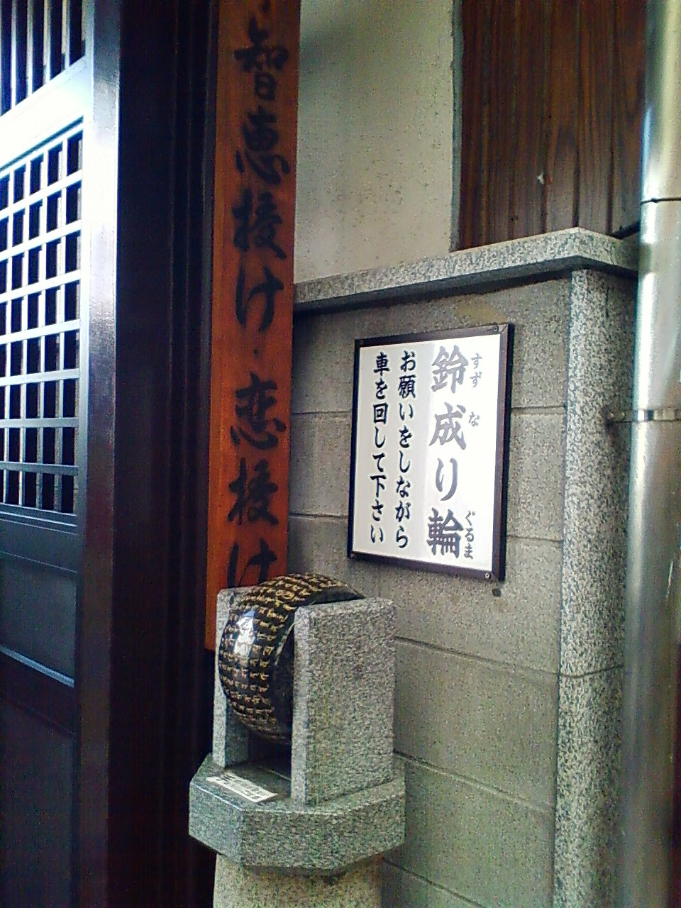 別の山門側には高さ4メートルはあろうか和泉式部供養塔が建っています。写真を撮るとバックに高層ビルが入ります。また、ここの山門脇に鈴成り輪が置かれています。観光客のみなさん、わけわからず廻している様は滑稽ですね(願い事の案内書きありますが)。