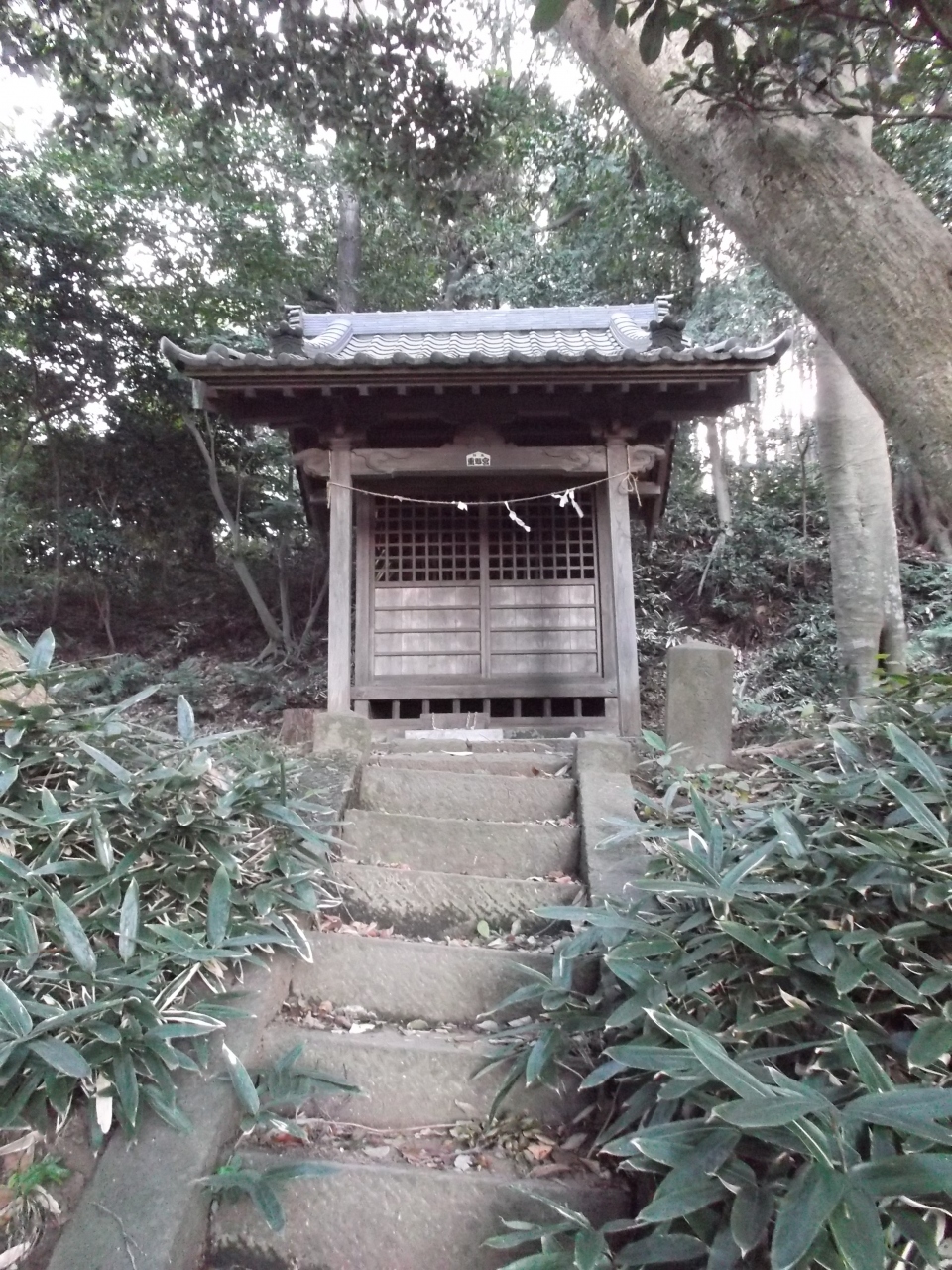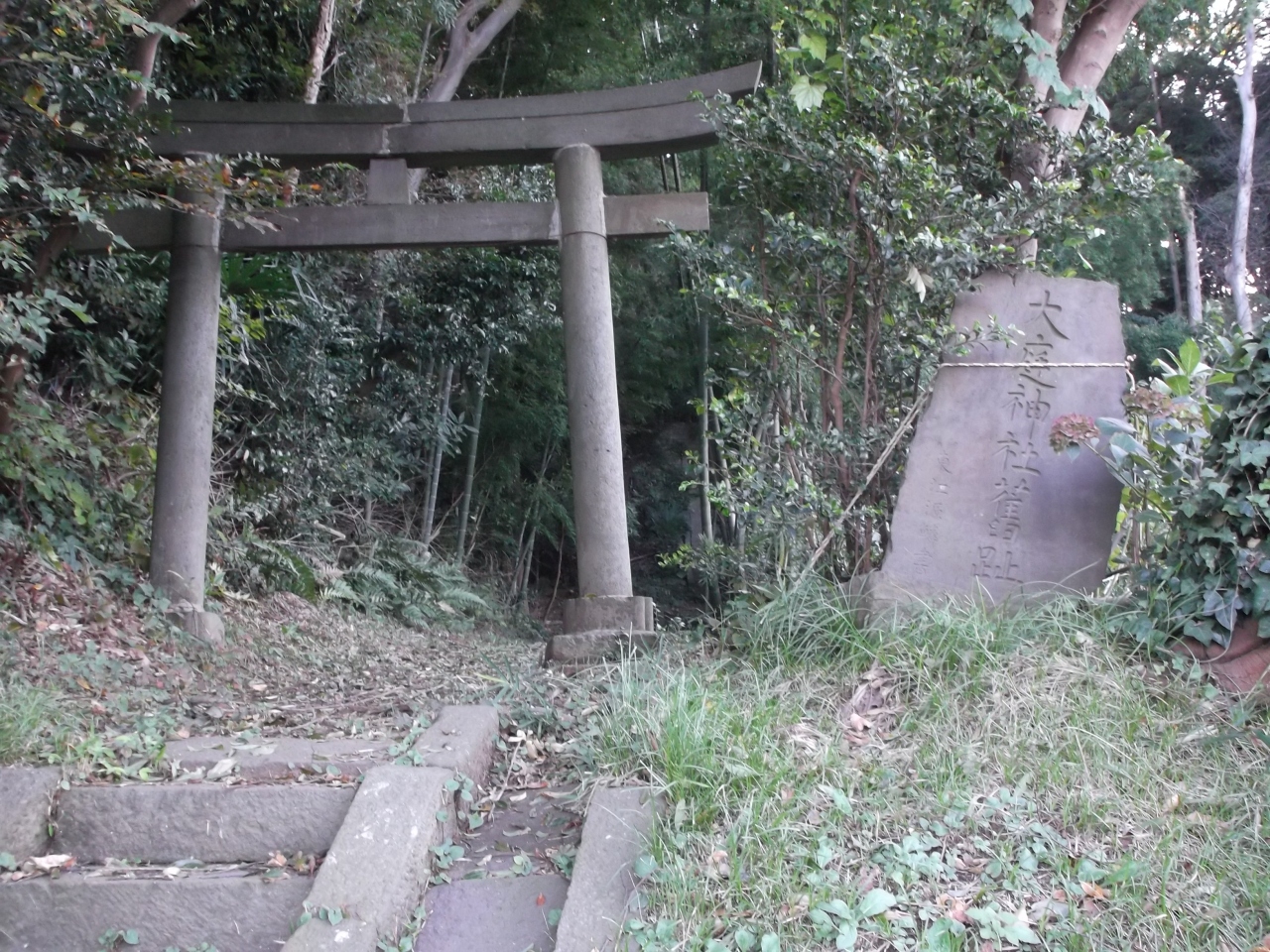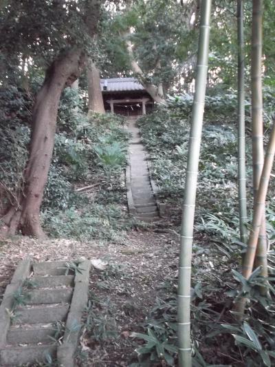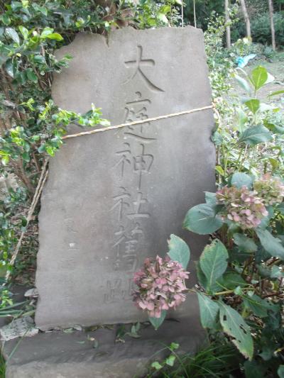 大庭の里、田園生活路から竹薮繁る森に入るところに古い鳥居、傾きかけてる石標があります。鳥居には「天保四発己年十二月造之 東江源鱗○」と刻まれています。石標は「大庭神社舊」(現地旧字の為間違いご容赦)とあります。落ち葉踏みしめ急で狭い石段の足元には短い笹群、登り詰めると昼なお暗い鬱蒼とした樹木の空間にこれまた古い社殿があります。ここが熊野神社、地図によっては大庭神社。探求していませんが、石標からして元は大庭神社なのでしょう(藤沢市稲荷に大庭神社あり)。でも、別の熊野神社が大庭地区にありますネ。なにやら深くなりそうなので止めます。探求心ある方には魅力でしょう。