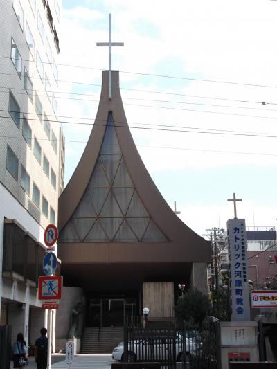 河原町通のホテルや商業ビルの谷間に十字架の建物があります。市役所、本能寺が至近距離。