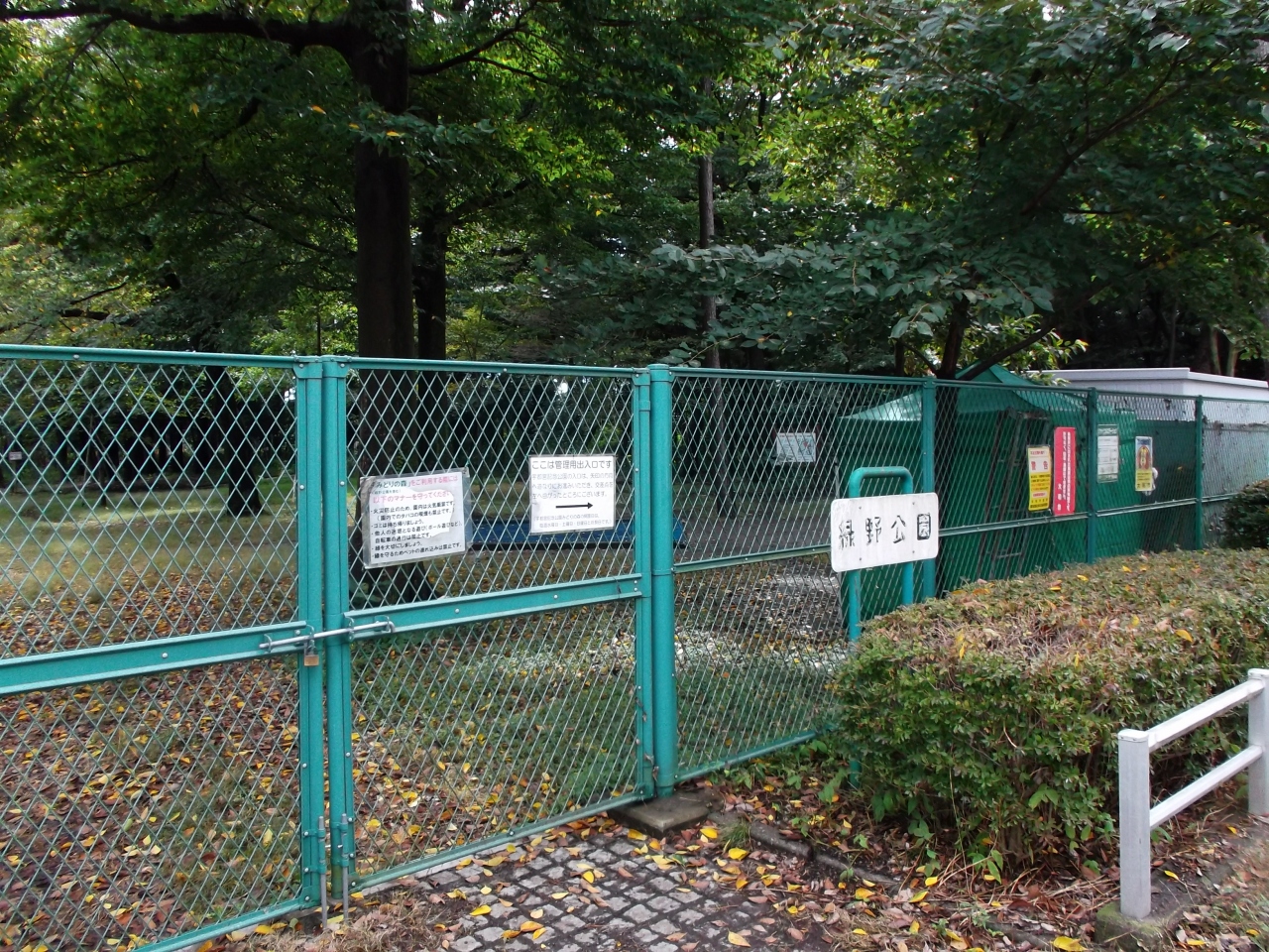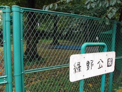 マンション前(或いは後方)の宇都宮記念公園との間の通り添いフェンスに、「緑野公園」文字を発見、横には注意書き札があり、閉鎖・入口は宇都宮記念公園とあります。