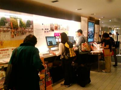 観光・グルメ・お土産・イベント行事の各種小誌、チラシ類が盛り沢山配置されています。奥のカウンターは相談席、大きなリック姿の外国人やら中国語が飛び交っているのはまさに国際観光の京都を感じます。
