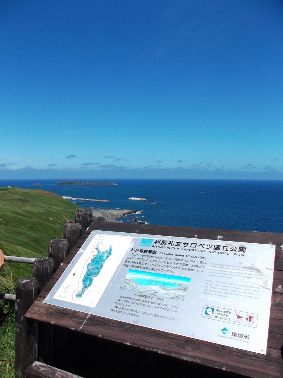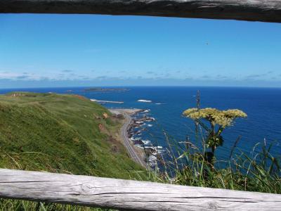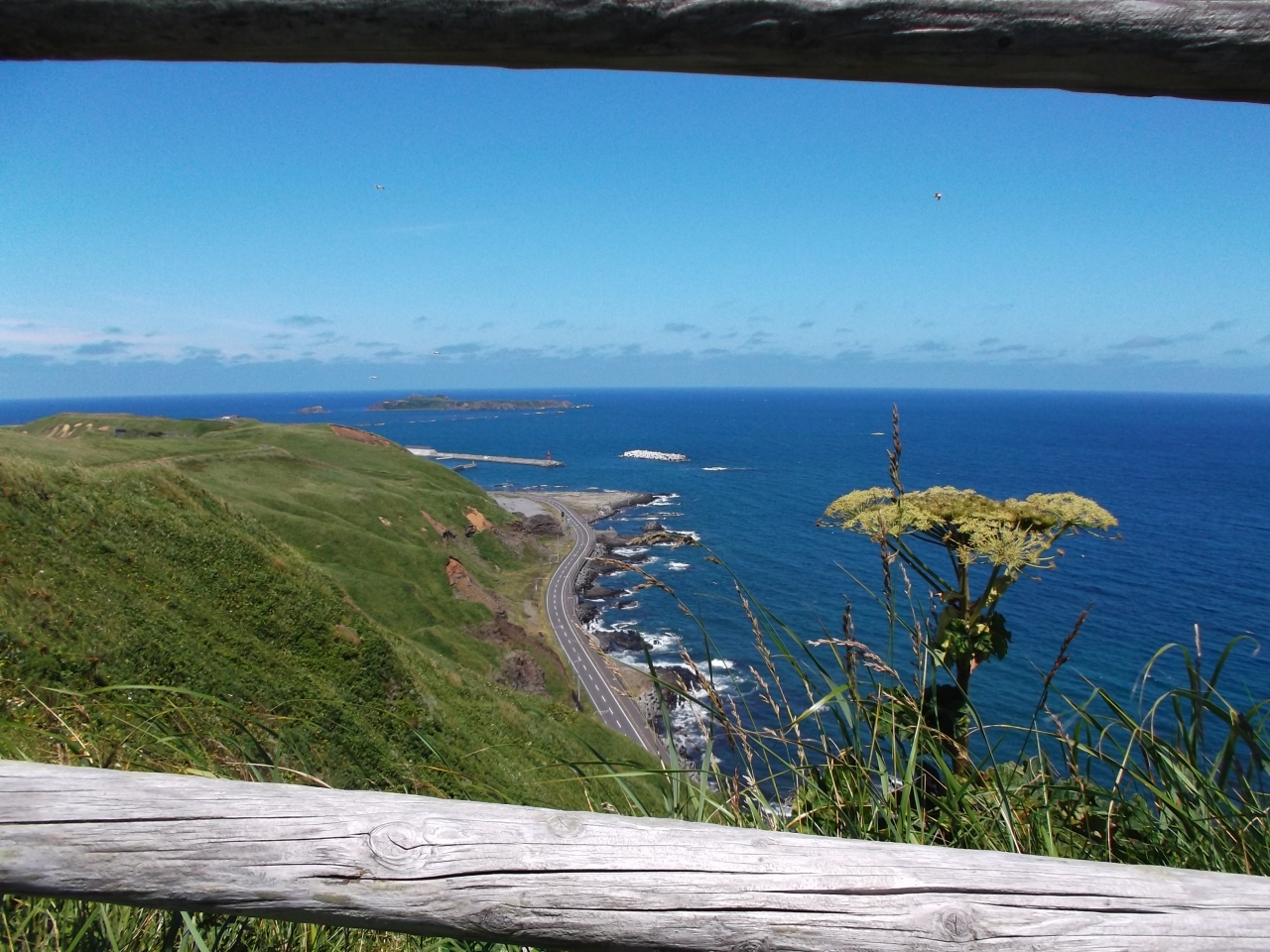 山を背負った位地なので後方は景色ありませんが、前方海側はパノラマ景色。下方には先端に走る道路そして港が、岬の情景を眺めることができます。海の遠望にはトド島、天候次第で利尻富士やサハリンまでが望めます。