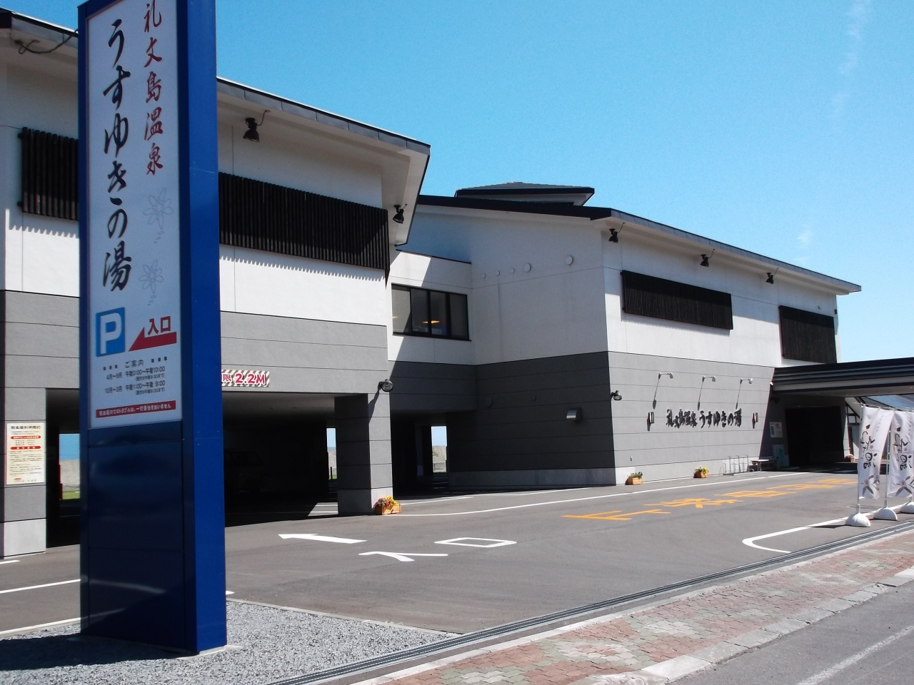 ニシン御殿風の外観、湯船は大きくありませんが内風呂には熱湯、温湯、ジャグジー、サウナもあります。源泉掛け流しの温泉とあります。