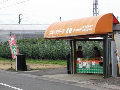 名称からフルーツ狩り農園とは思いましたが・・。長後駅で聞いたら歩いても10分かからないよと言われました。長後市民センターを越えたあたりにフルーツ販売小屋が現れます。ふたつ、みっつの小屋があるひとつに「フルーツパーク長後」とあります。この周囲はみな果樹園です。もぎ取り、直売しています。訪ねた8月下旬の旬は、なしとブドウでした。