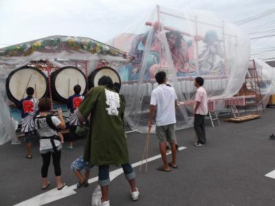本番前に現地入りしましたら、駅付近の駐車場広場では屋台の仕込み準備が大忙し、待機場の大太鼓が鳴り響き、その周りを浴衣姿の子供達がはしゃいでいました。